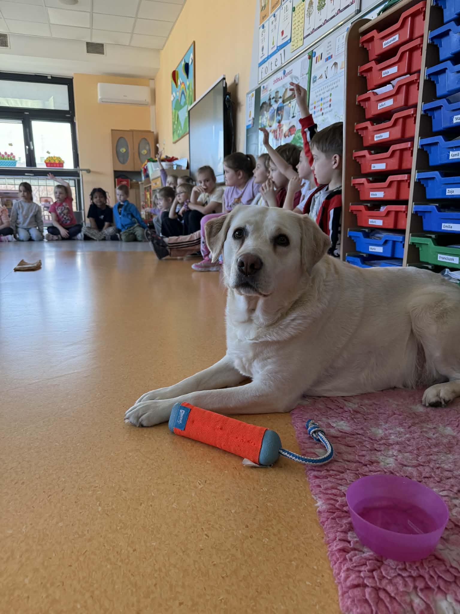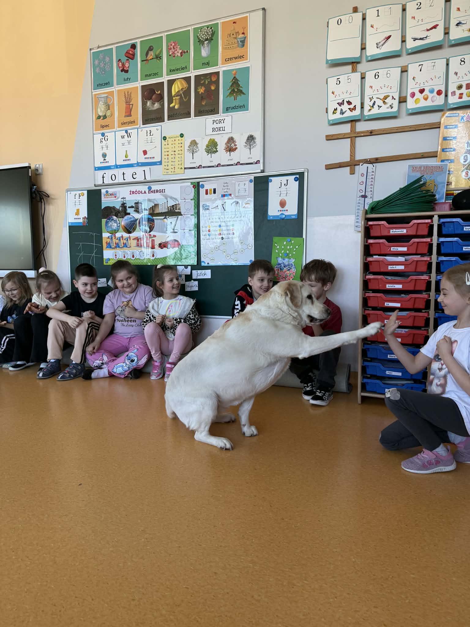 Nasze Przedszkole odwiedził wyjątkowy gość! Labradorka Zuma ze swoim opiekunem – panem Pawłem. Na zajęciach z dogoterapii, dzieci uczyły się prawidłowego zachowania względem psa oraz warunki i akcesoria niezbędne do pielęgnacji psa. Na koniec Zuma zaprezentowała nam kilka sztuczek oraz przybiła piątkę z każdym dzieckiem. Dzięki tym zajęciom już wiemy w jaki sposób zachowywać się w obecności piesków i jak się z nimi bawić.