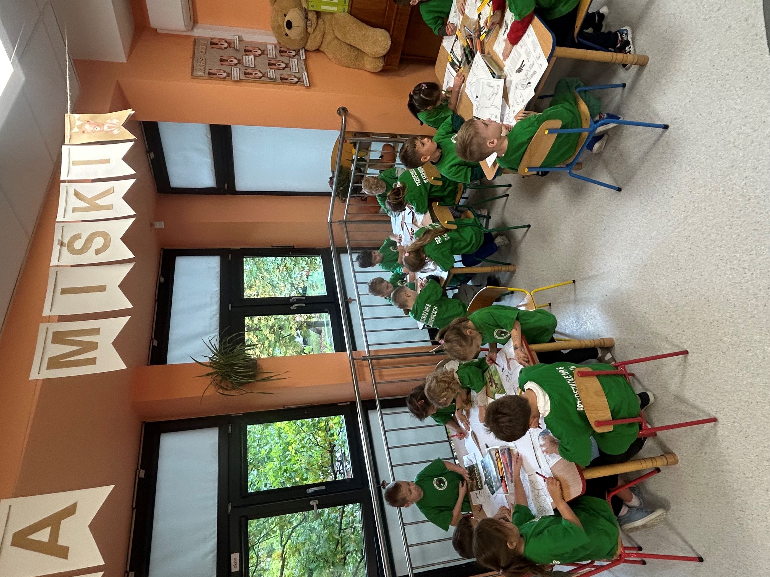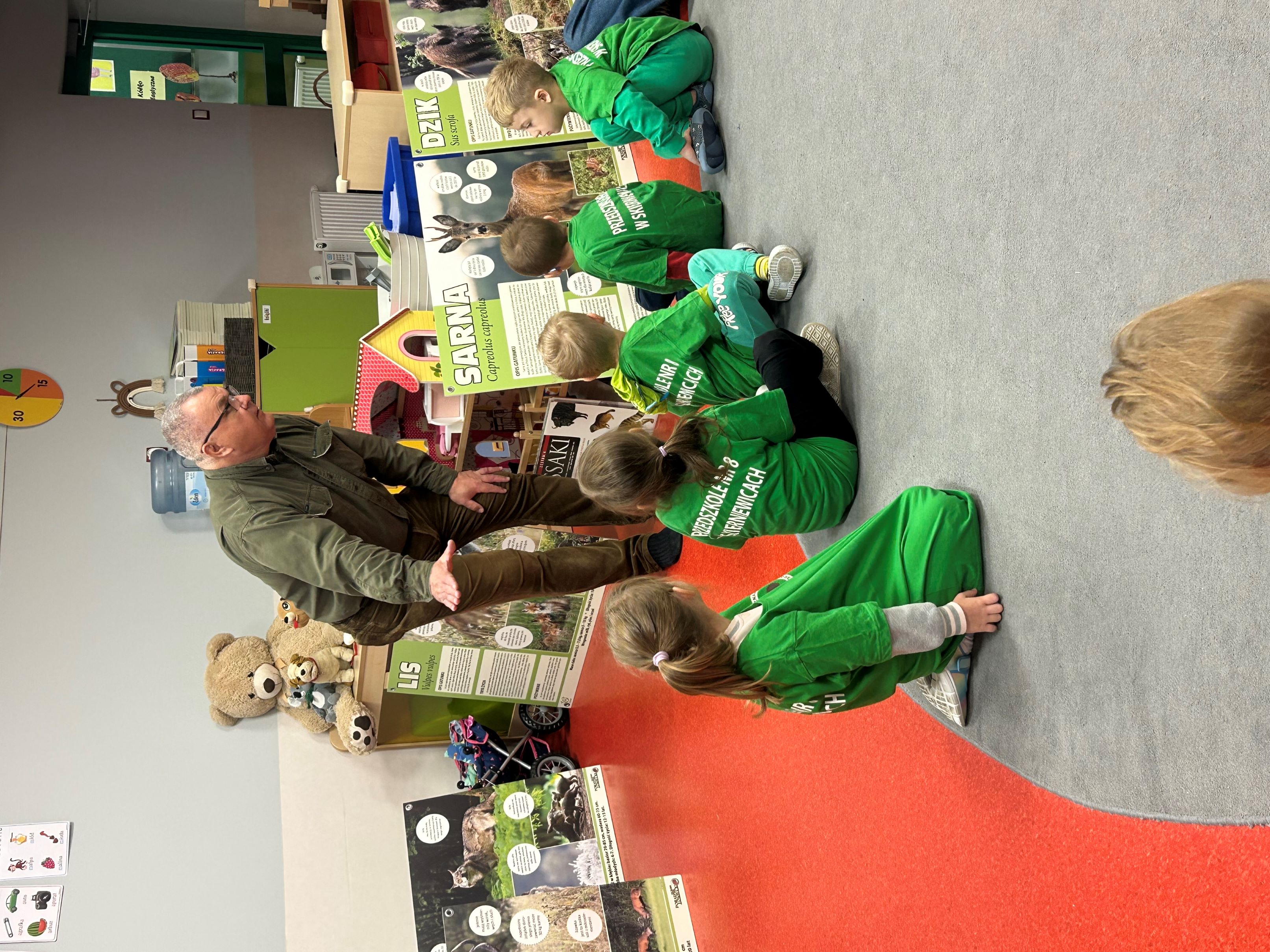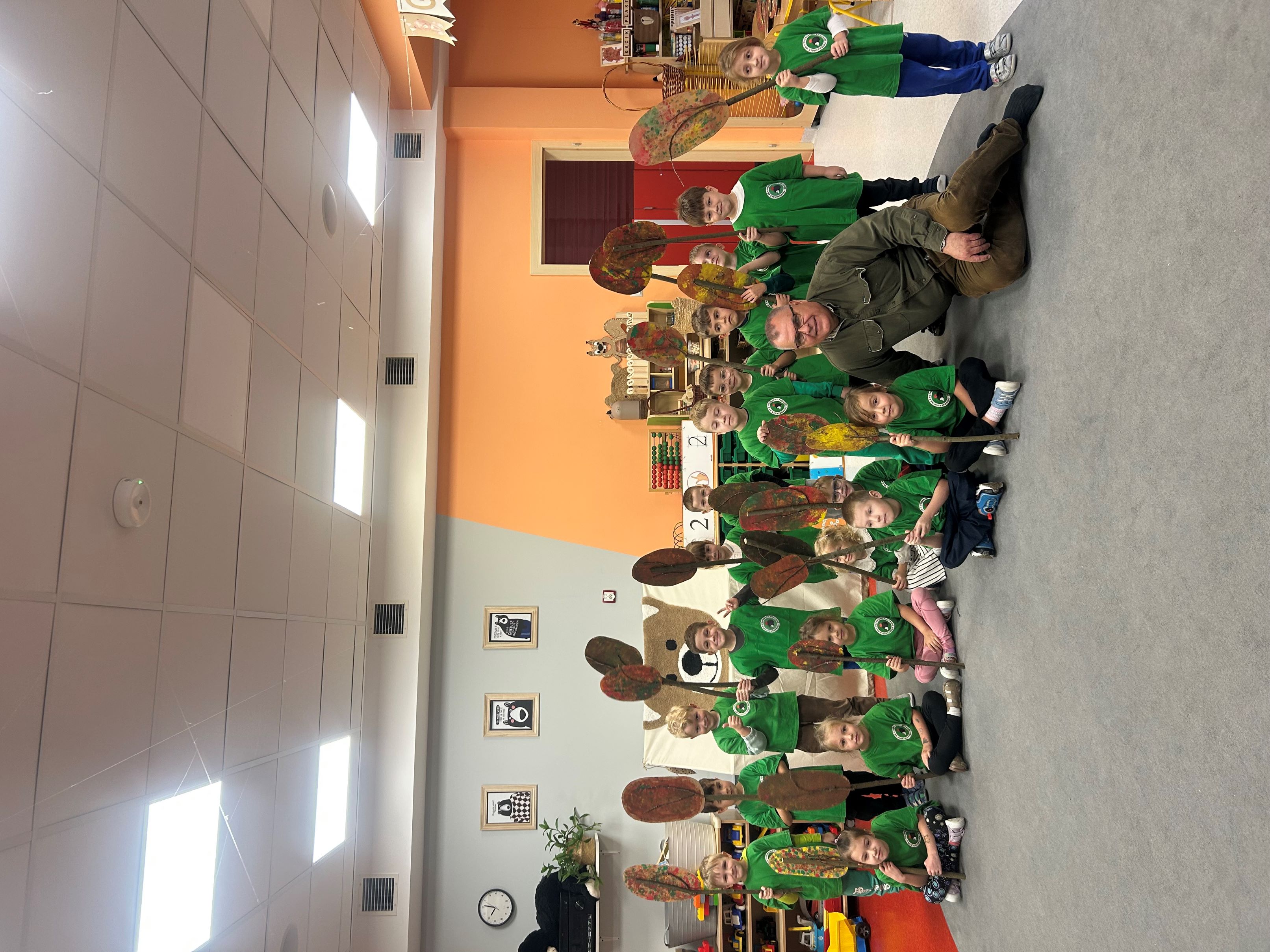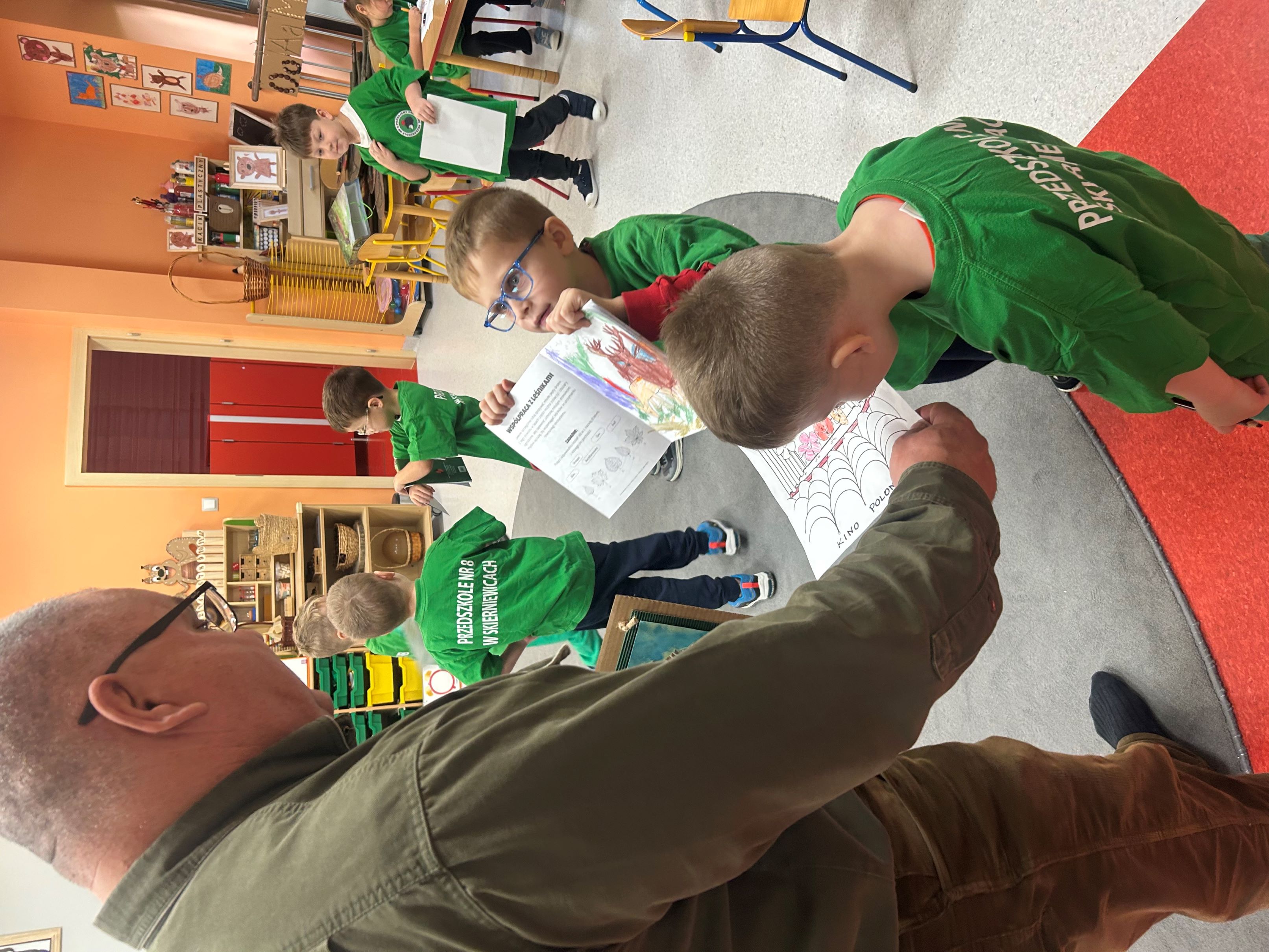 W związku z obchodami Dnia Drzewa, 10 października gościliśmy w naszej grupie Pana myśliwego, który przeprowadził dla nas zajęcia związane z tematyką drzew i mieszkańców lasów. Poznaliśmy rodzaje drzew, ich znaczenie dla człowieka, zwierząt i przyrody. Wykonaliśmy pracę plastyczno - techniczną - Jesienne drzewa, a prezenty, które dostaliśmy - kolorowanki i książeczki o tematyce ekologicznej, stały się dla nas okazją do integracji oraz poszerzenia wiedzy przyrodniczej.