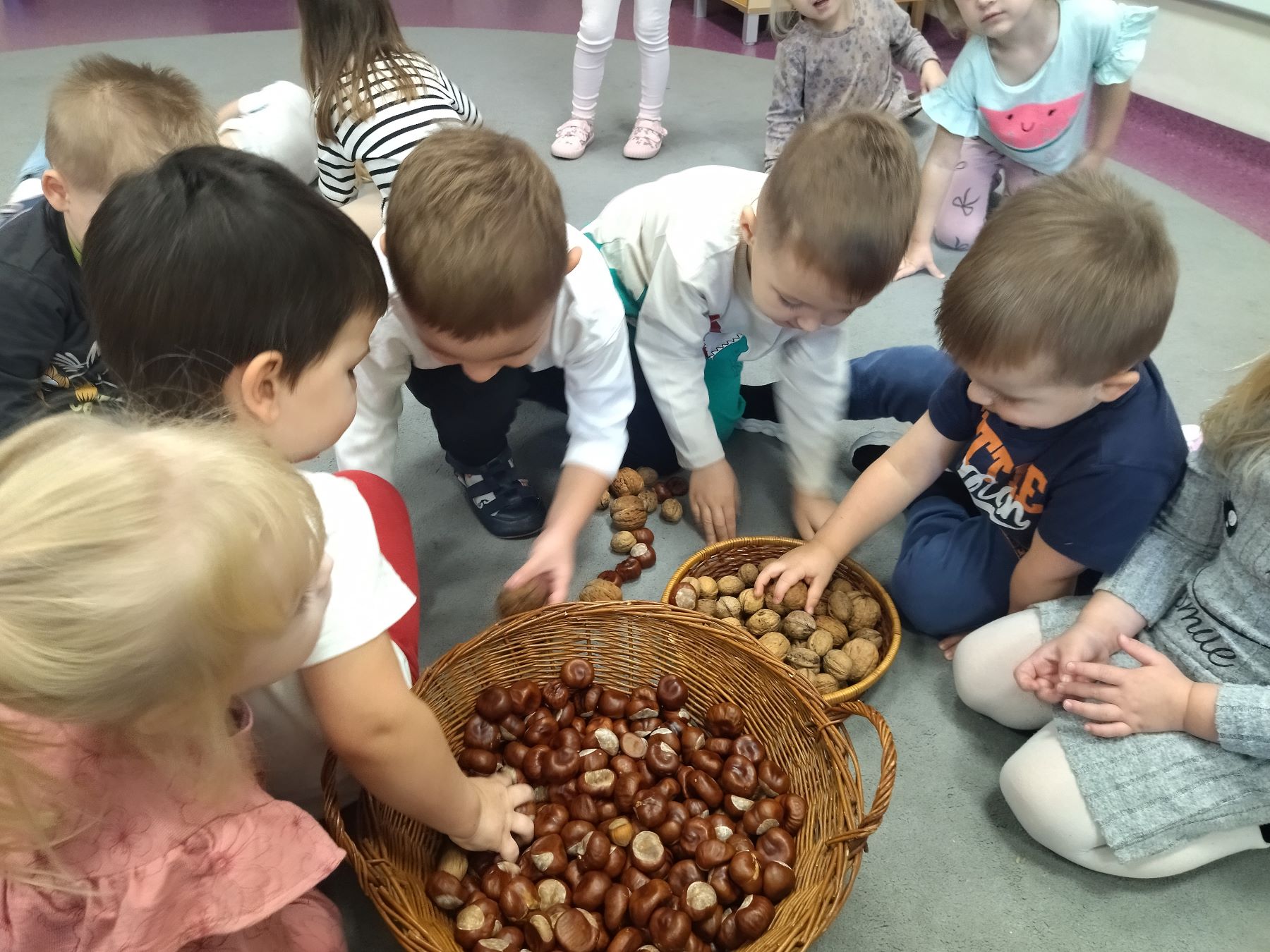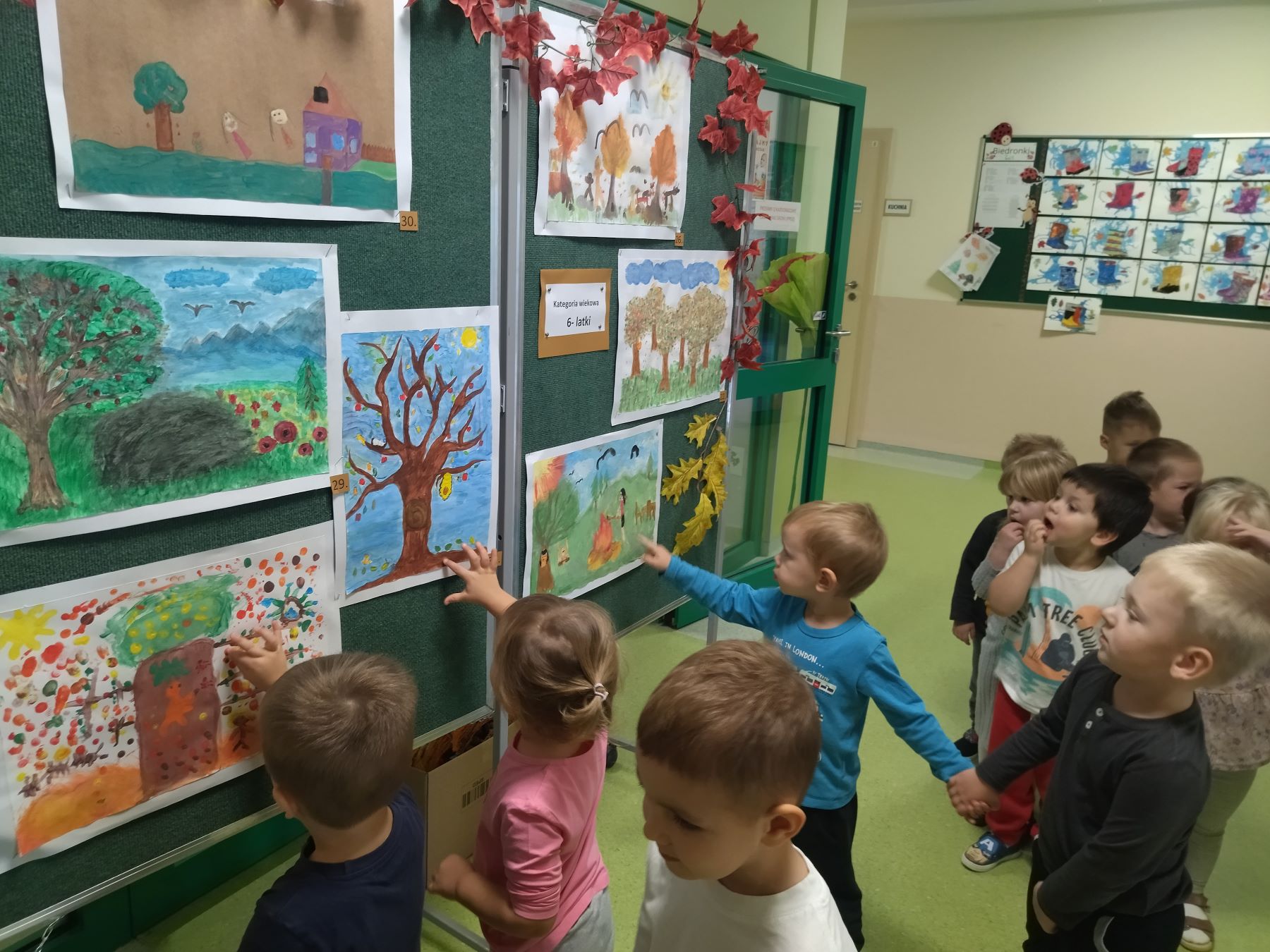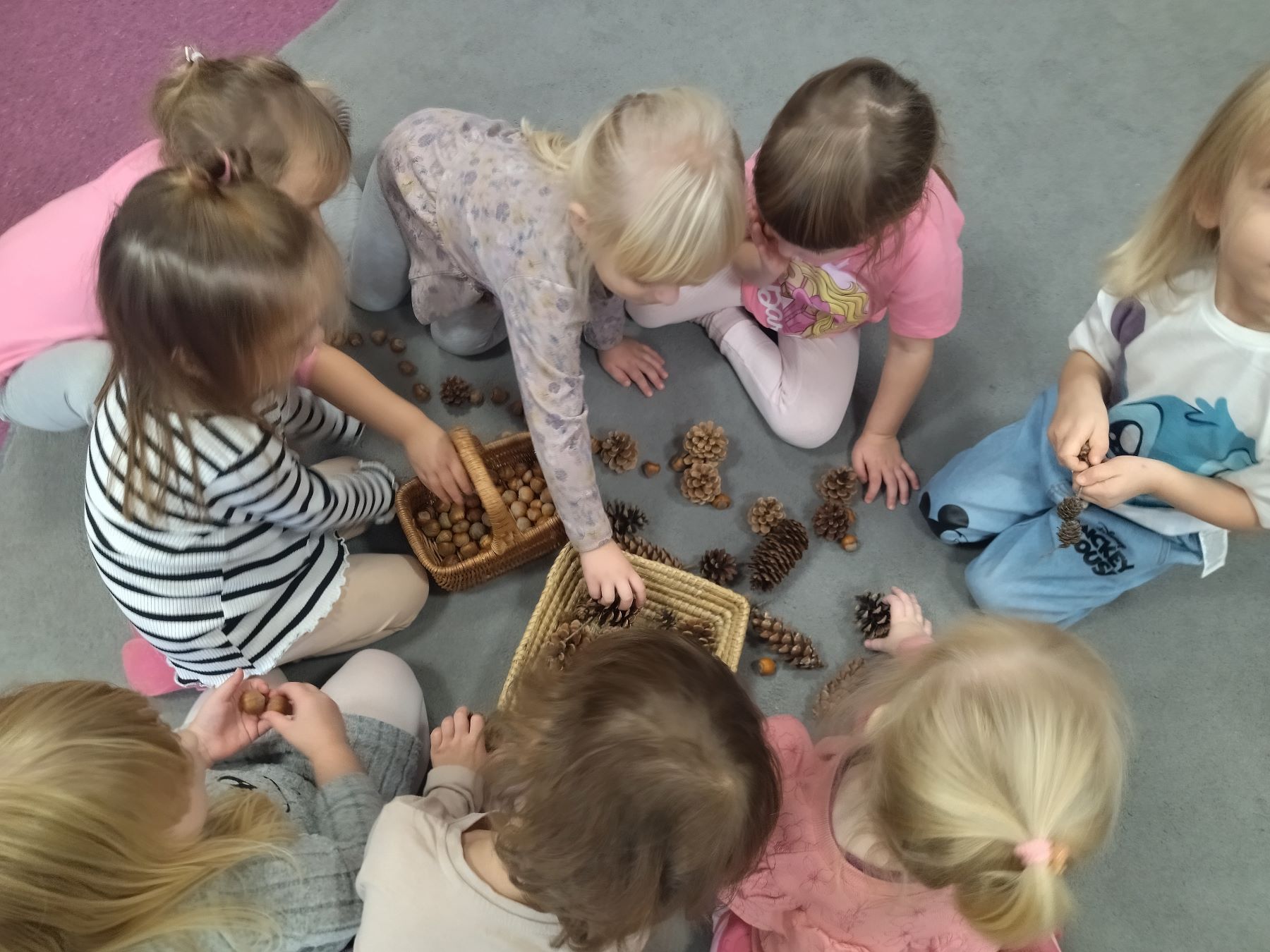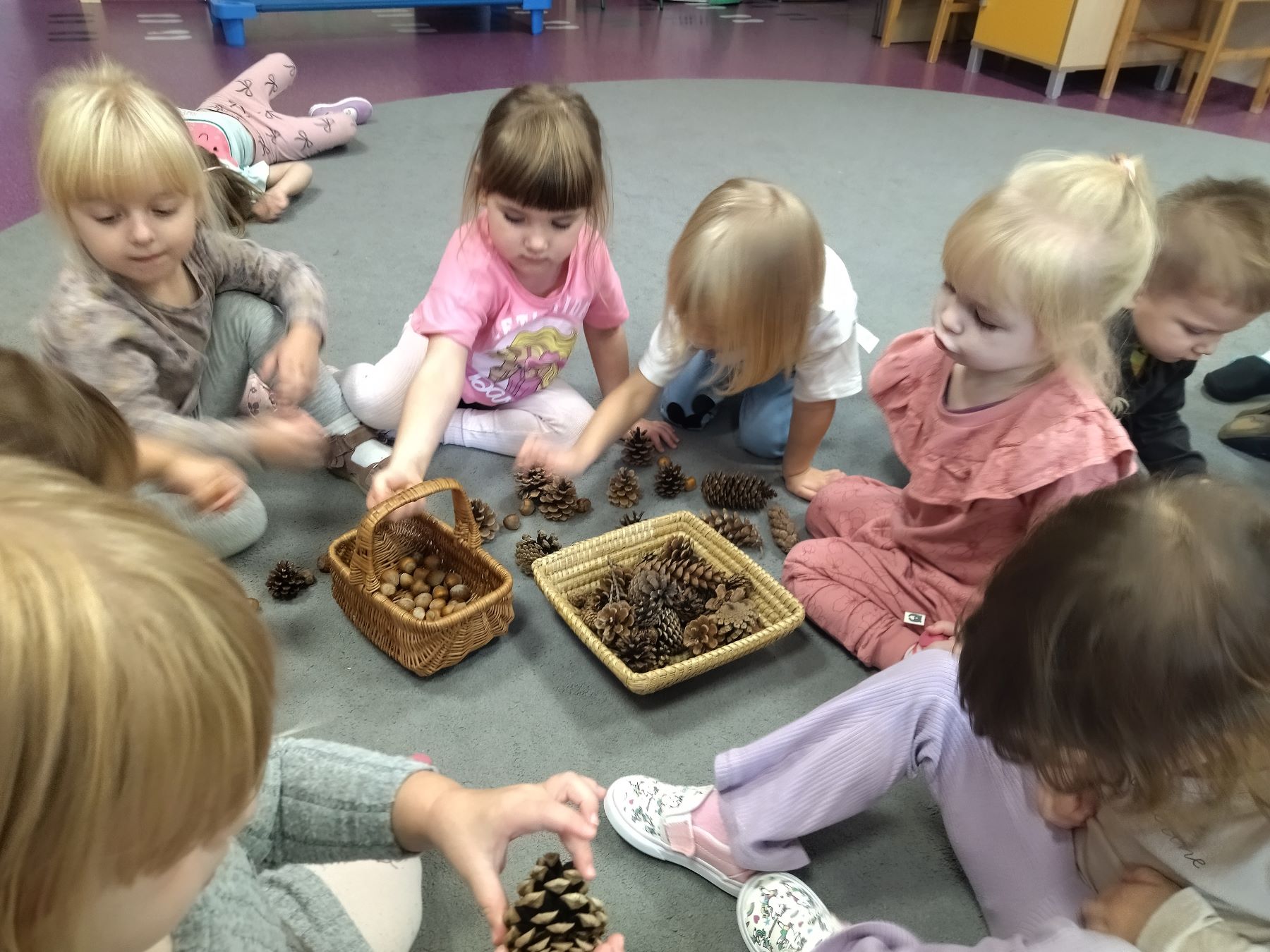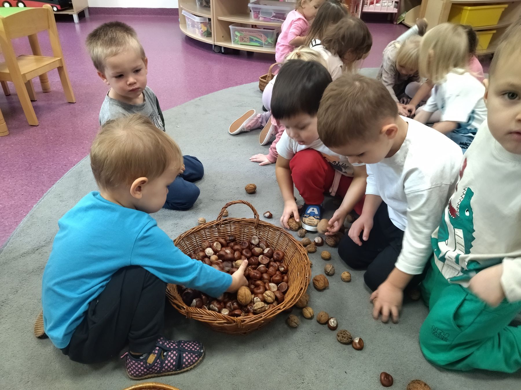 Myszki spędziły swój pierwszy Dzień Drzewa na zabawach w sali - były wiewiórkami szukającymi dziupli, tworzyły liście ze swoich dłoni, układały wzory z szyszek, kasztanów i orzechów, oglądały wystawę pięknych prac plastycznych i dobrze się przy tym bawiły.