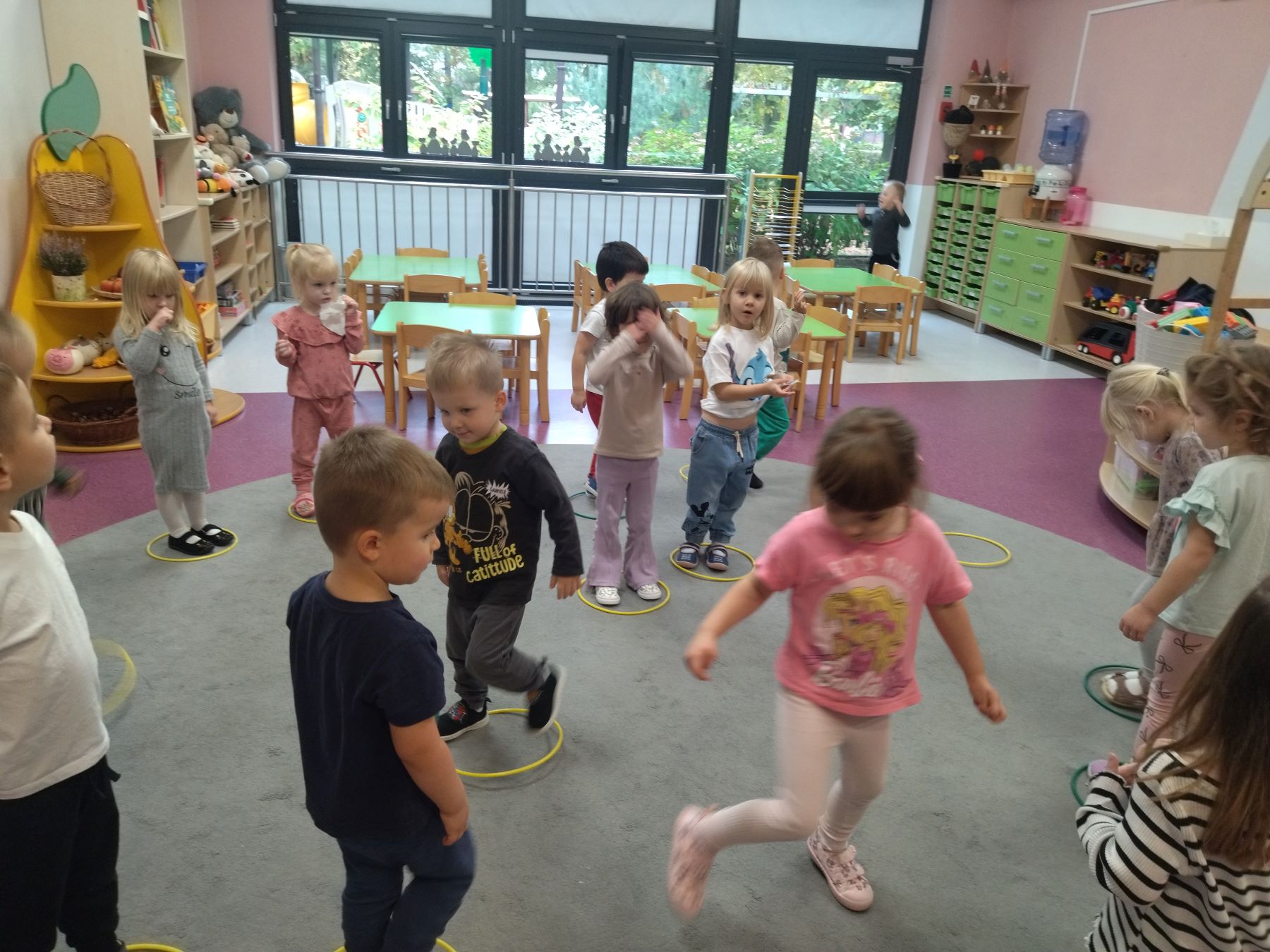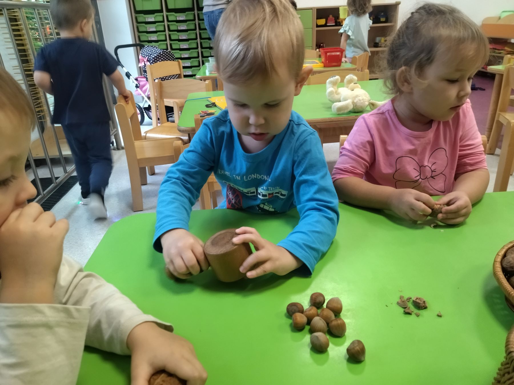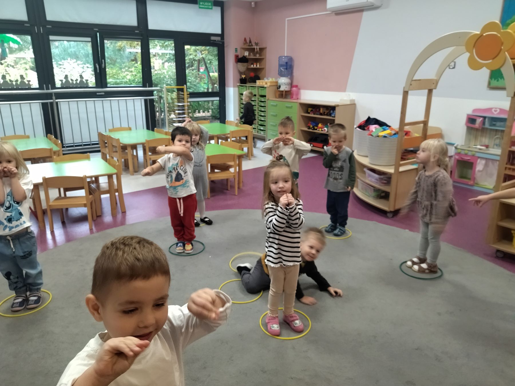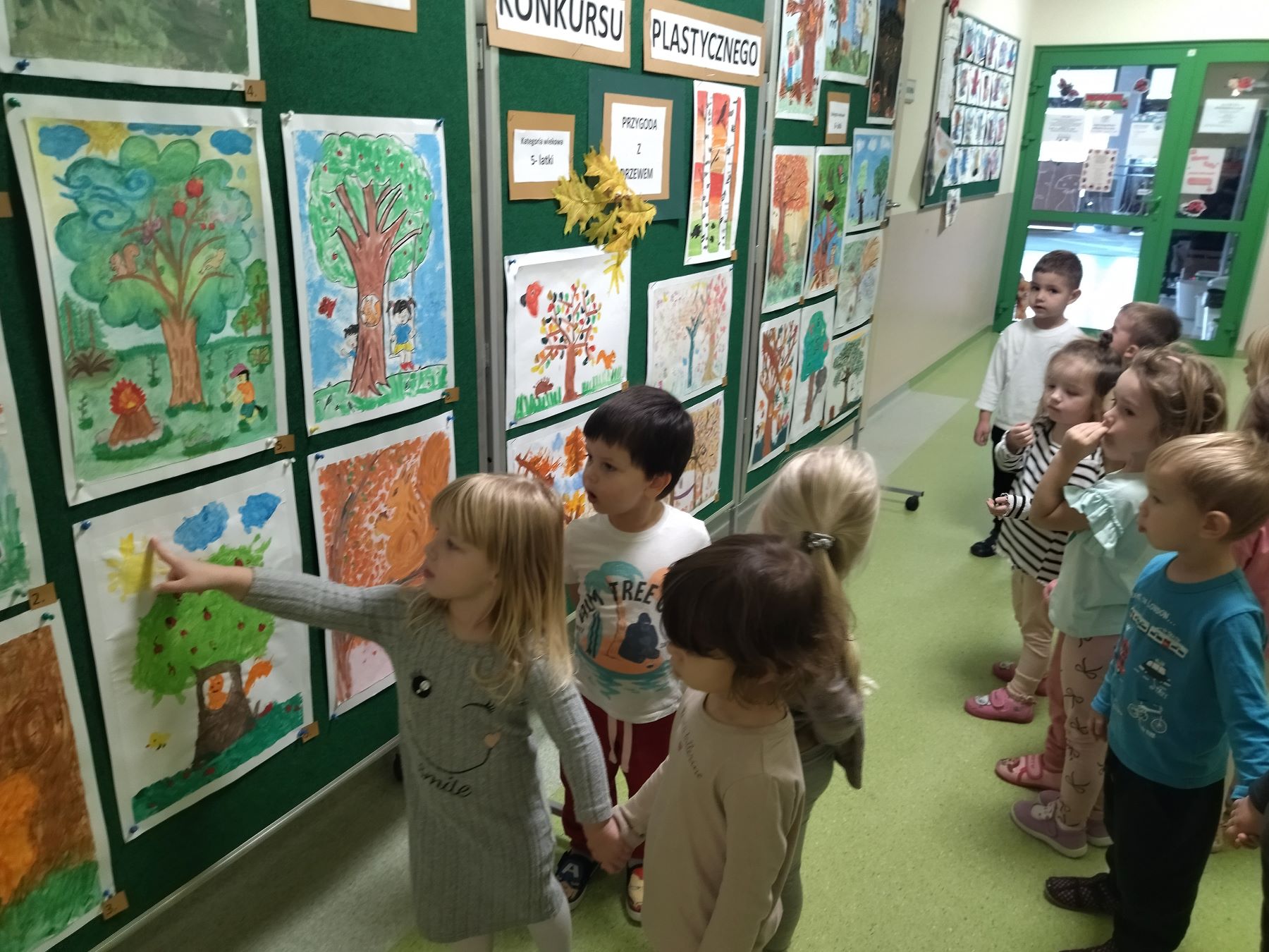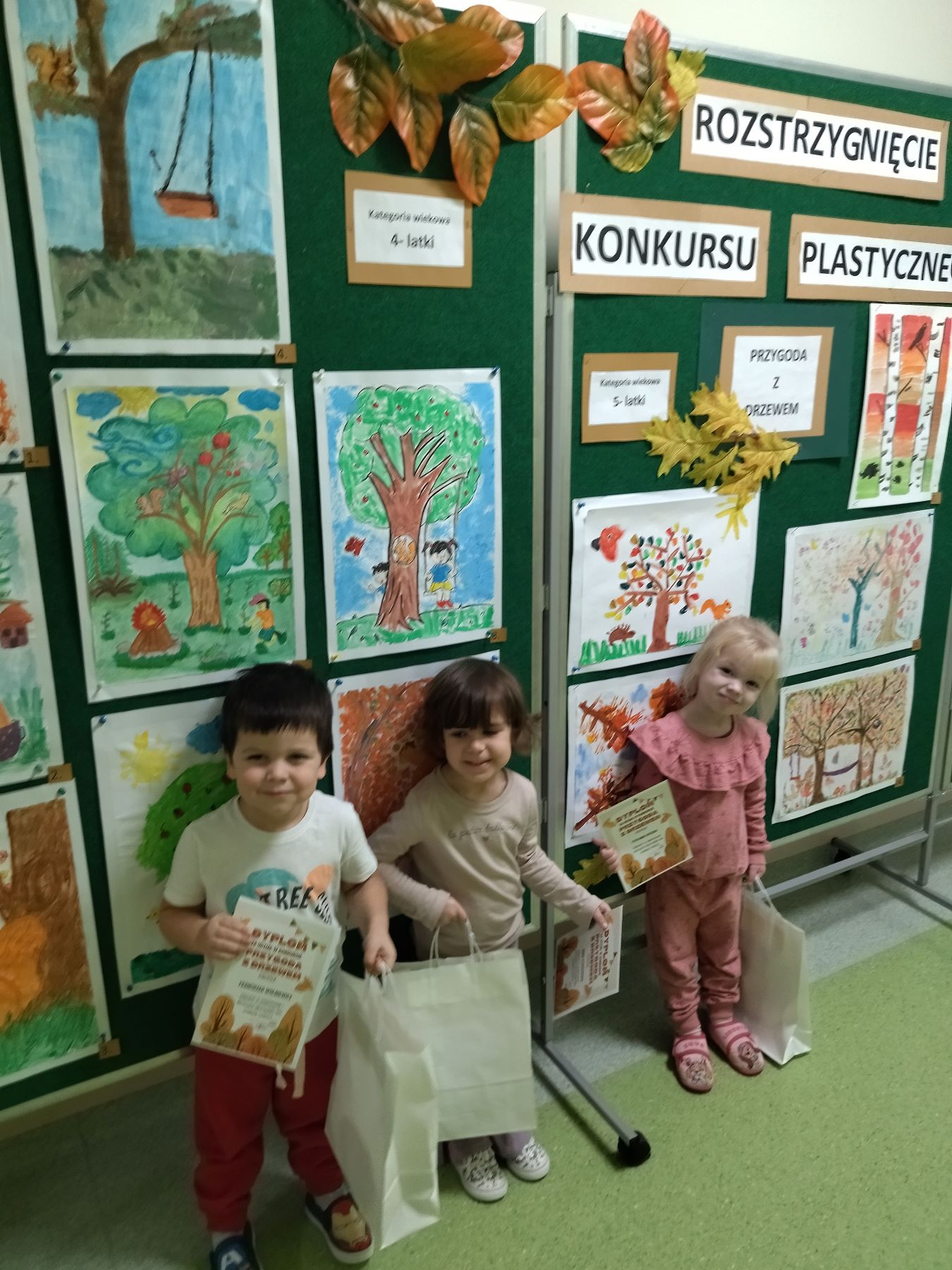 Myszki spędziły swój pierwszy Dzień Drzewa na zabawach w sali - były wiewiórkami szukającymi dziupli, tworzyły liście ze swoich dłoni, układały wzory z szyszek, kasztanów i orzechów, oglądały wystawę pięknych prac plastycznych i dobrze się przy tym bawiły.