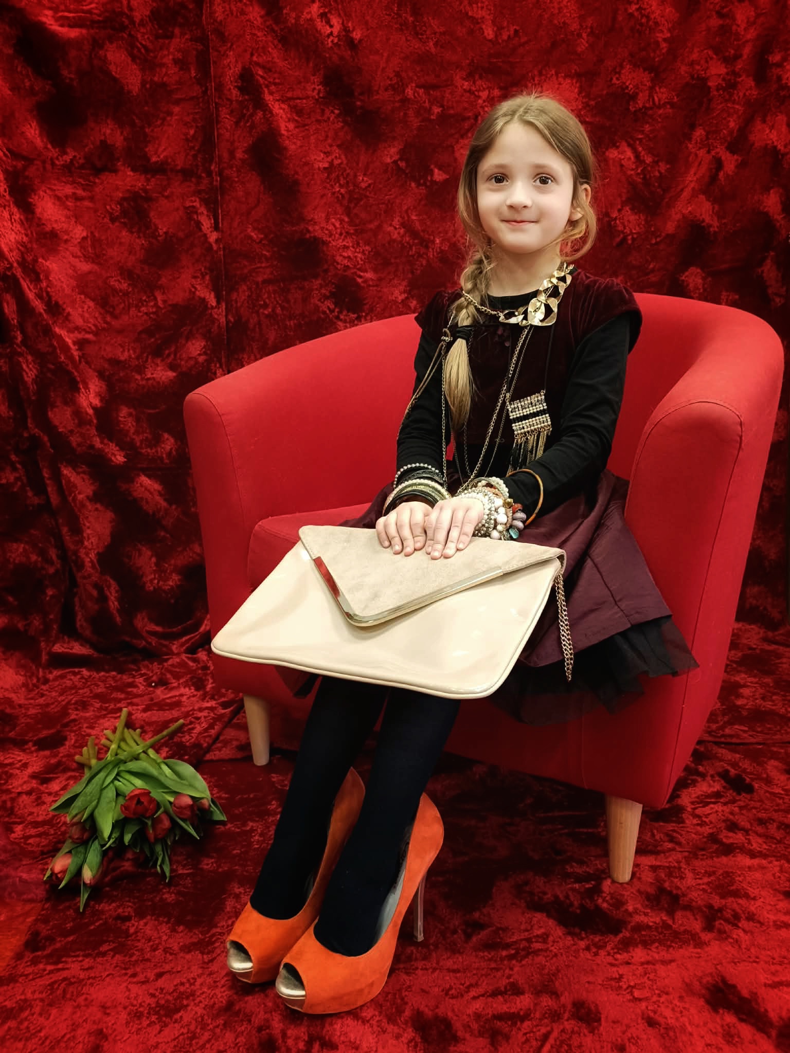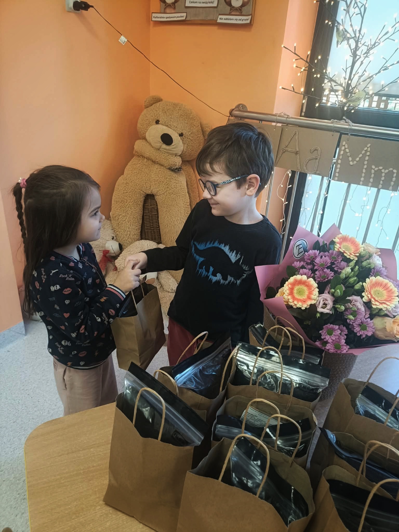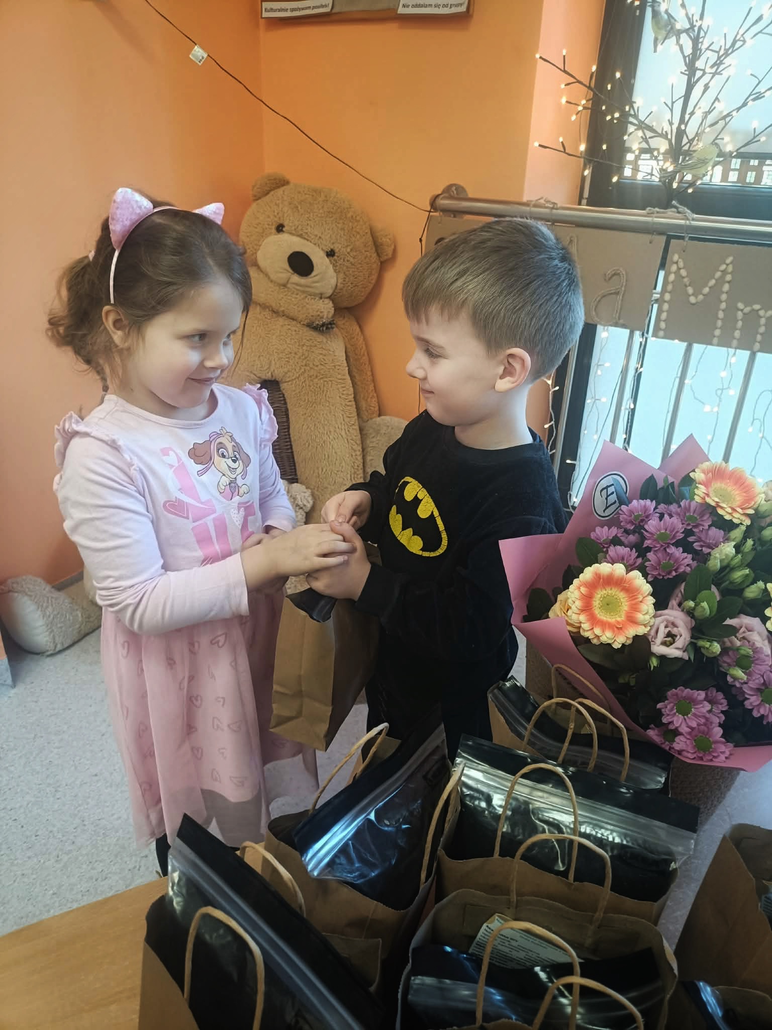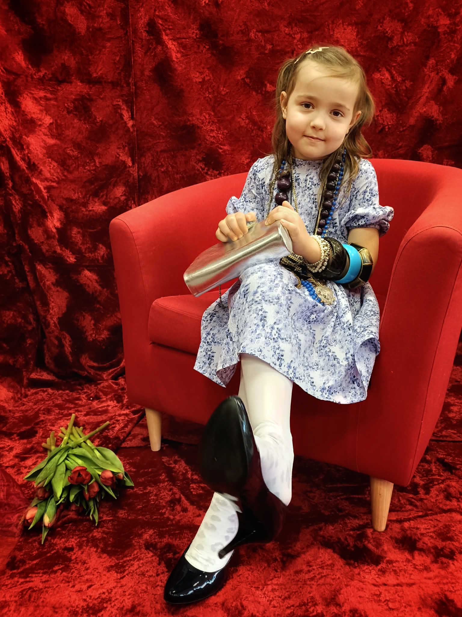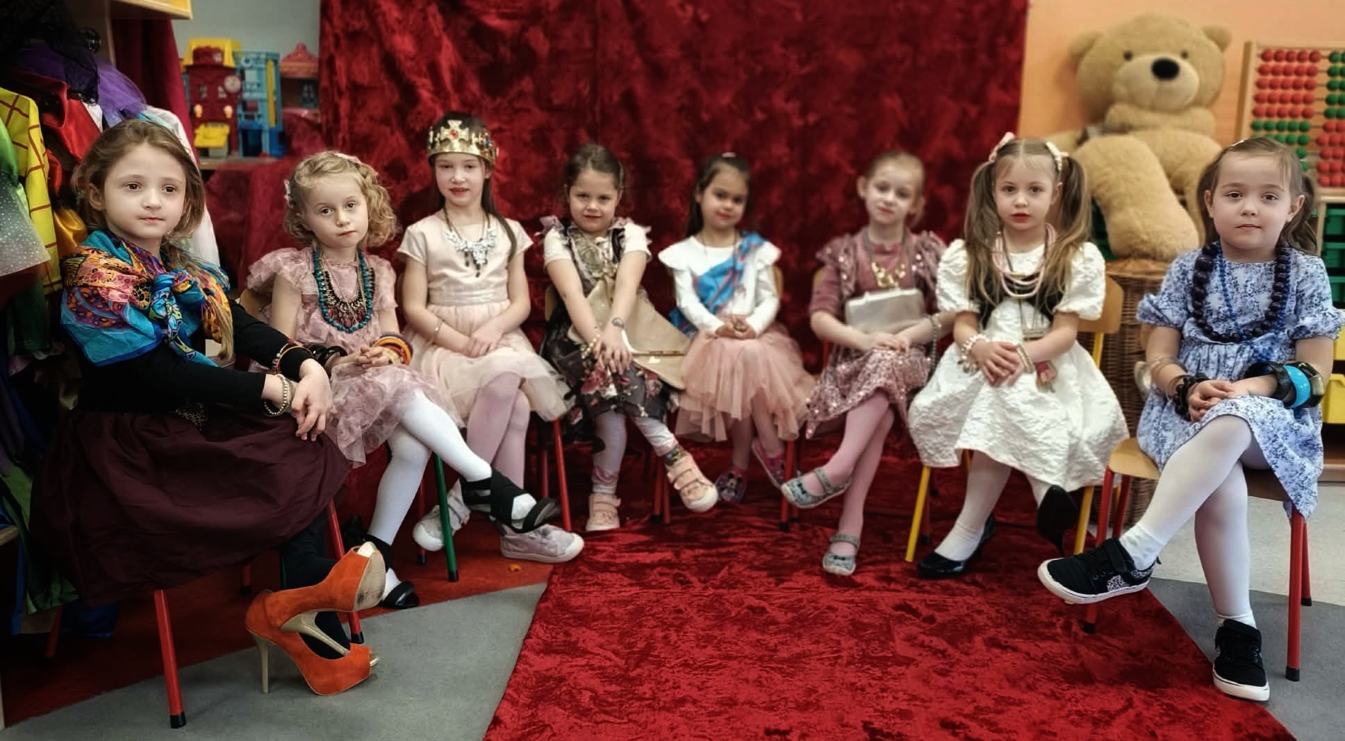 Z okazji Dnia Kobiet w poniedziałkowy poranek, dziewczynki przyszły do przedszkola ubrane w eleganckie sukienki. Na miejscu mogły dobrać do swoich stylizacji różne dodatki - torebki, bransoletki, naszyjniki oraz buty na obcasie. Następnie odbyła się pamiątkowa sesja zdjęciowa. Dziewczynki pozowały na czerwonym fotelu jak prawdziwe gwiazdy, dzięki czemu mogły choć na chwilę poczuć, jak wyjątkowo jest być kobietą. Chłopcy również przygotowali się do tego dnia - założyli koszule swoich tatusiów i eleganckie krawaty. Z dużą powagą i zaangażowaniem wręczyli koleżankom upominki przygotowane przez rodziców. Był to bardzo miły dzień, pełen uśmiechu, życzliwości i wspólnego świętowania.
