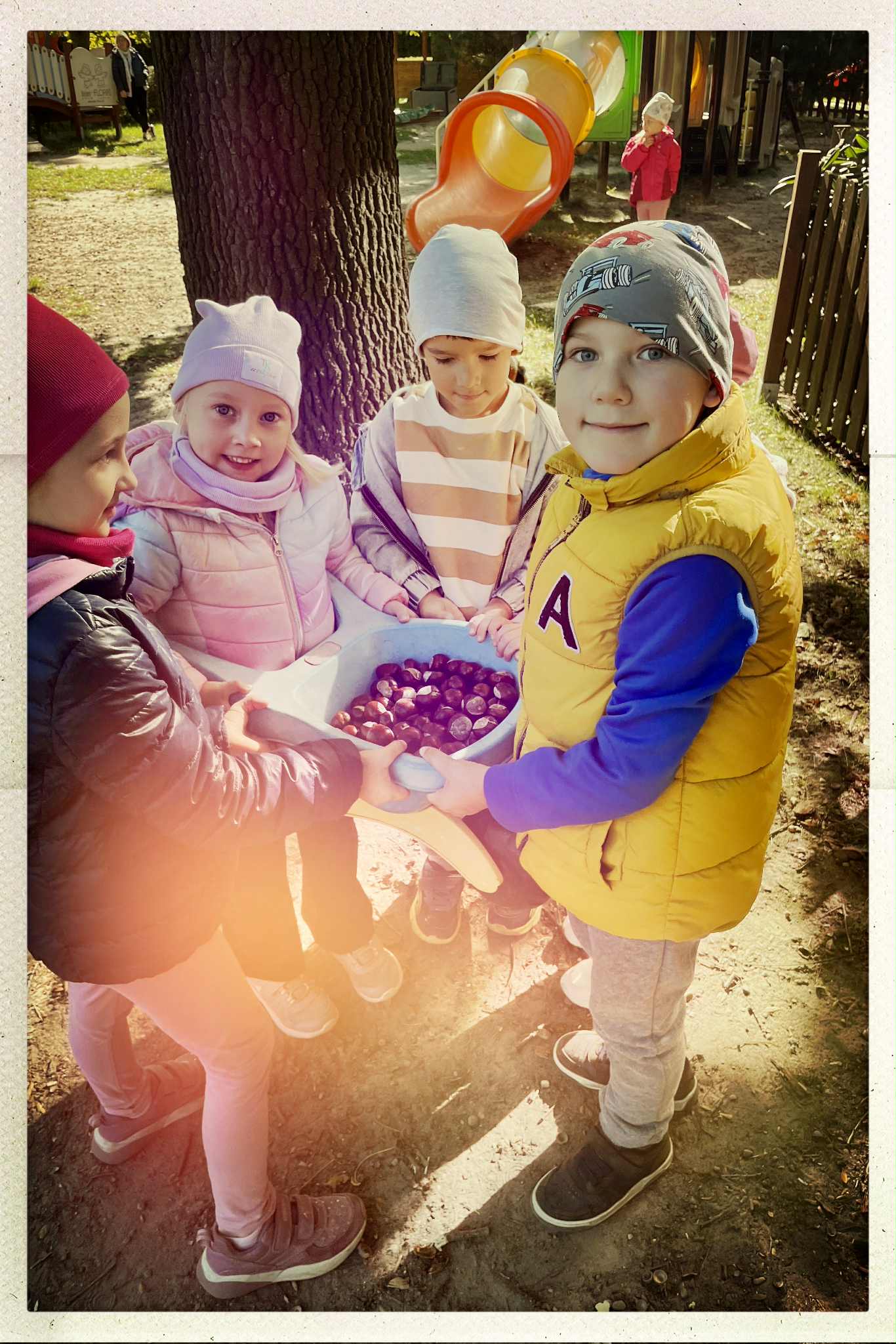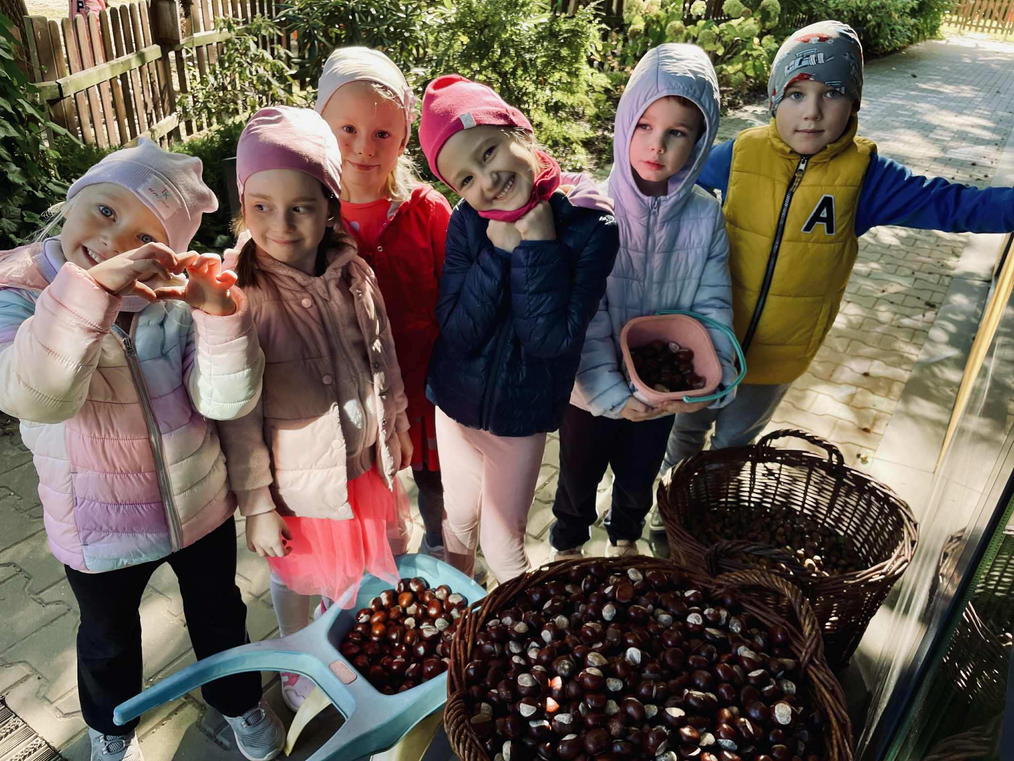W grupie Słoneczka małe rączki z wielkim sercem zbierają kasztany dla Hani. Każdy zebrany owoc to symbol dobroci, nadziei i ciepła, które dzieci z radością ofiarowują, by pomóc drugiemu sercu bić mocniej.