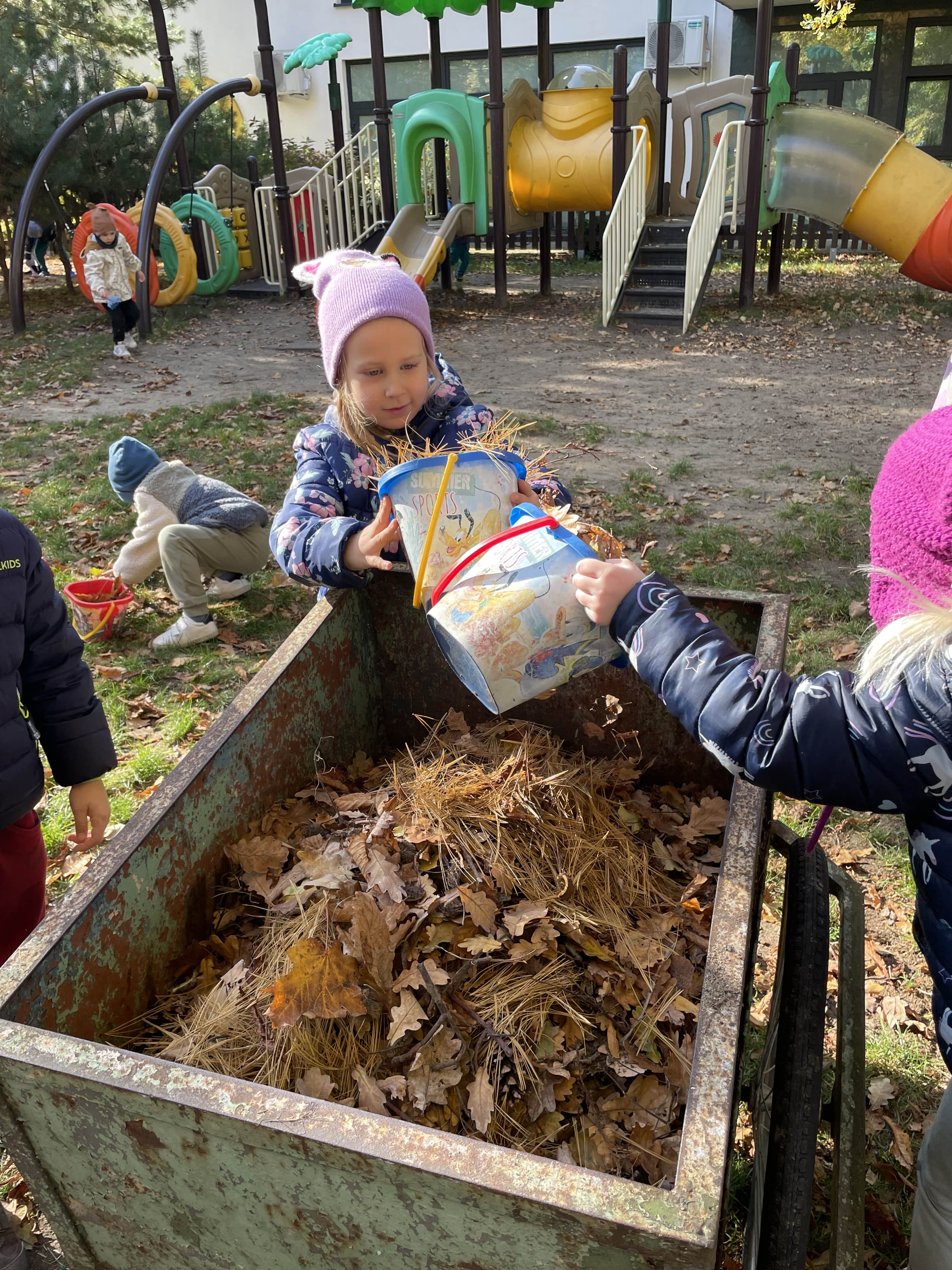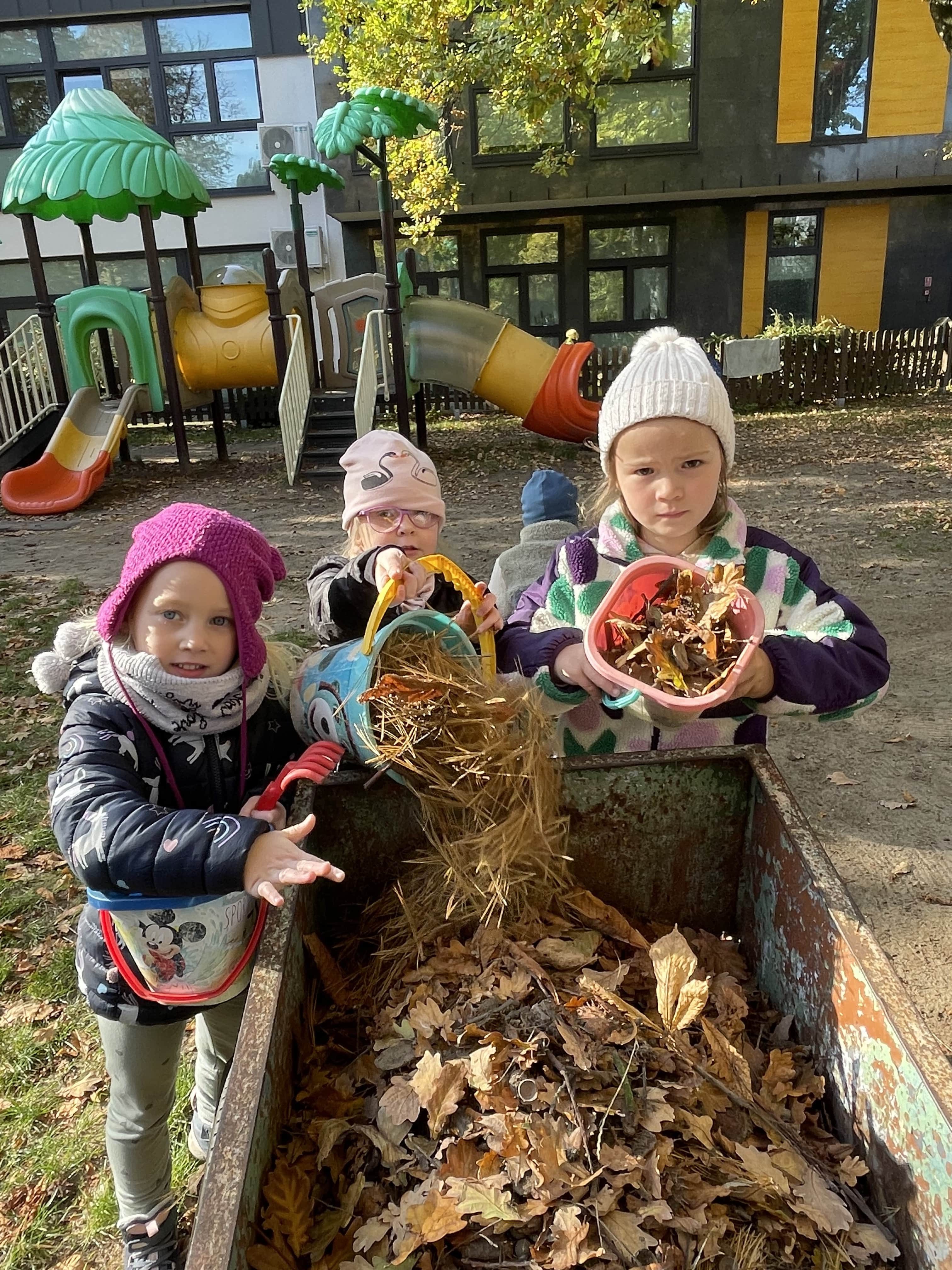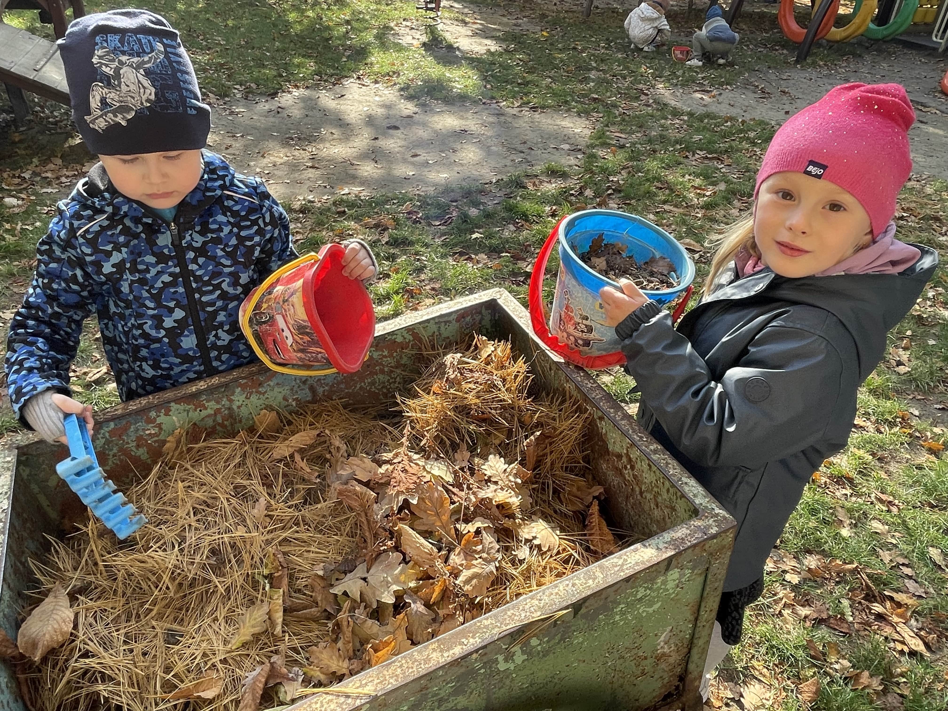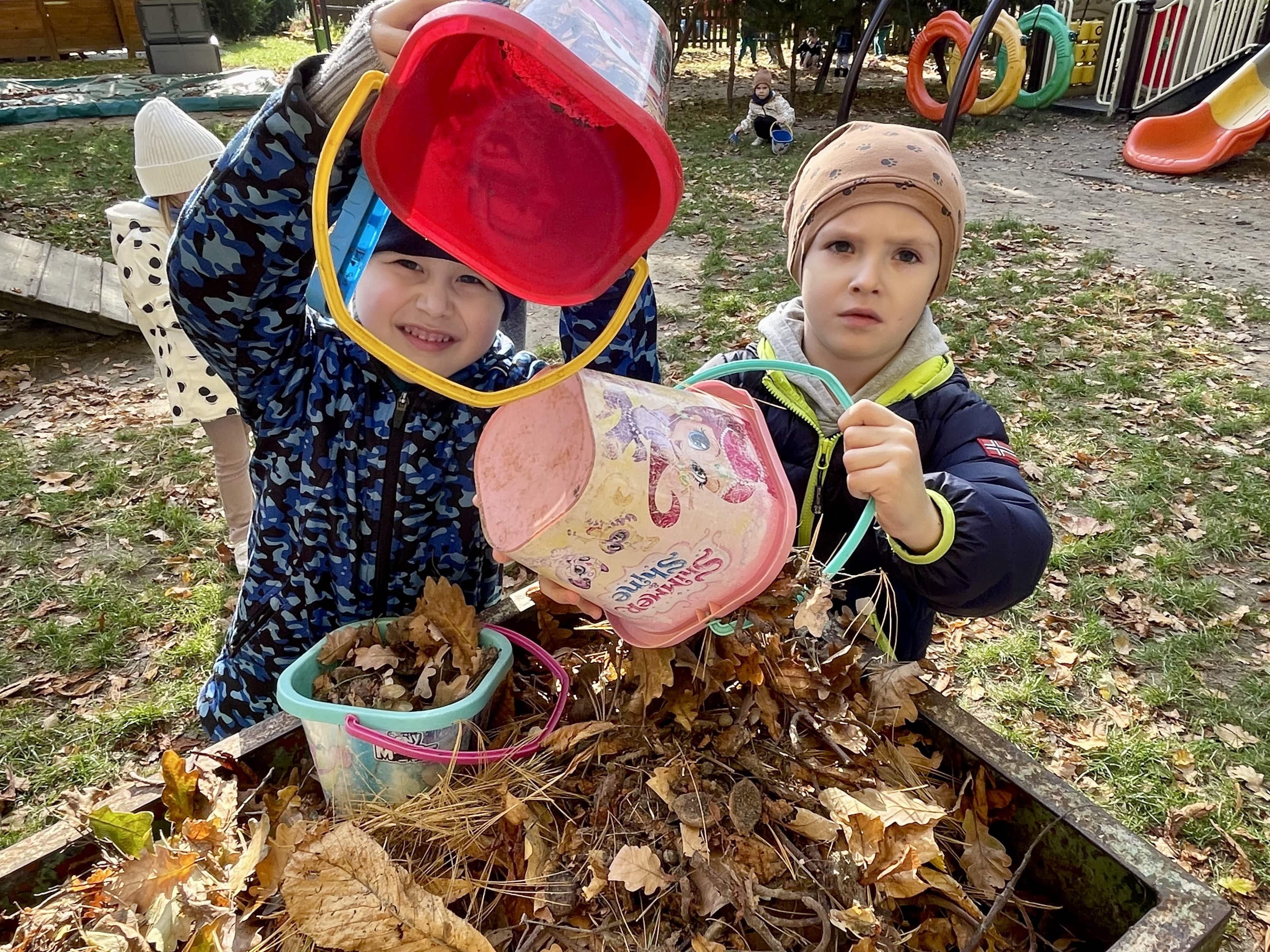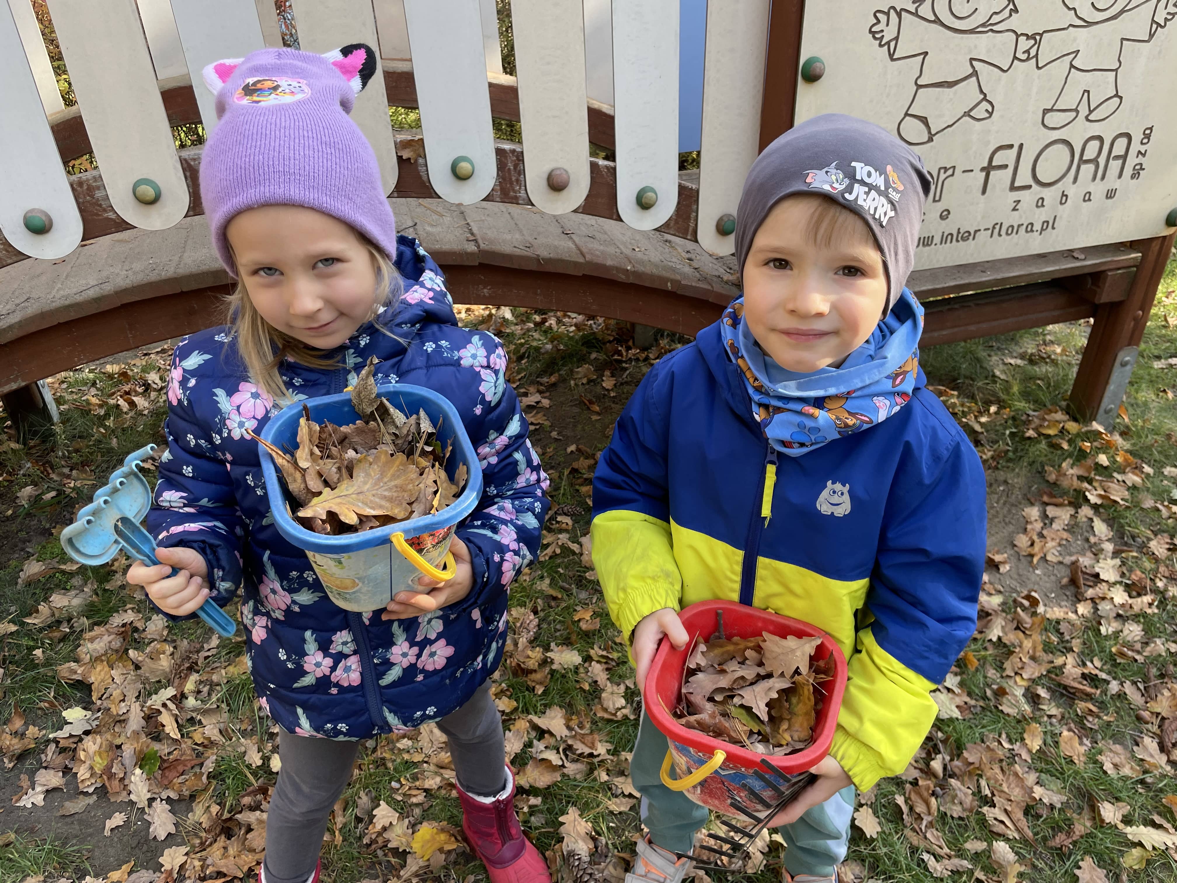Jesienią grupa Słoneczka porządkowała ogród przedszkolny, przygotowując go do zimy. Dzieci z zaangażowaniem grabiły liście, porządkowały rabaty i uczyły się, jak dbać o rośliny oraz otoczenie przedszkola.