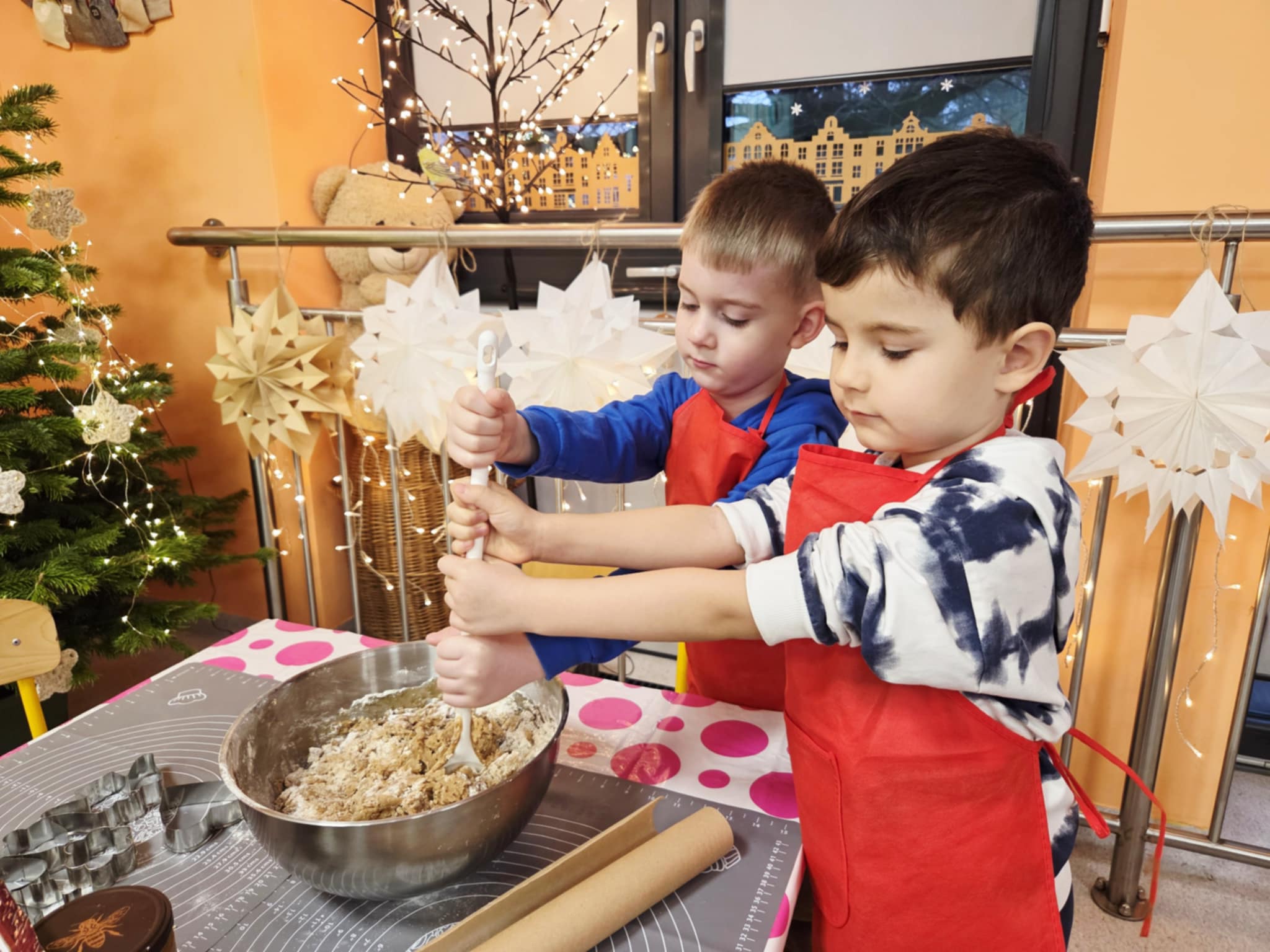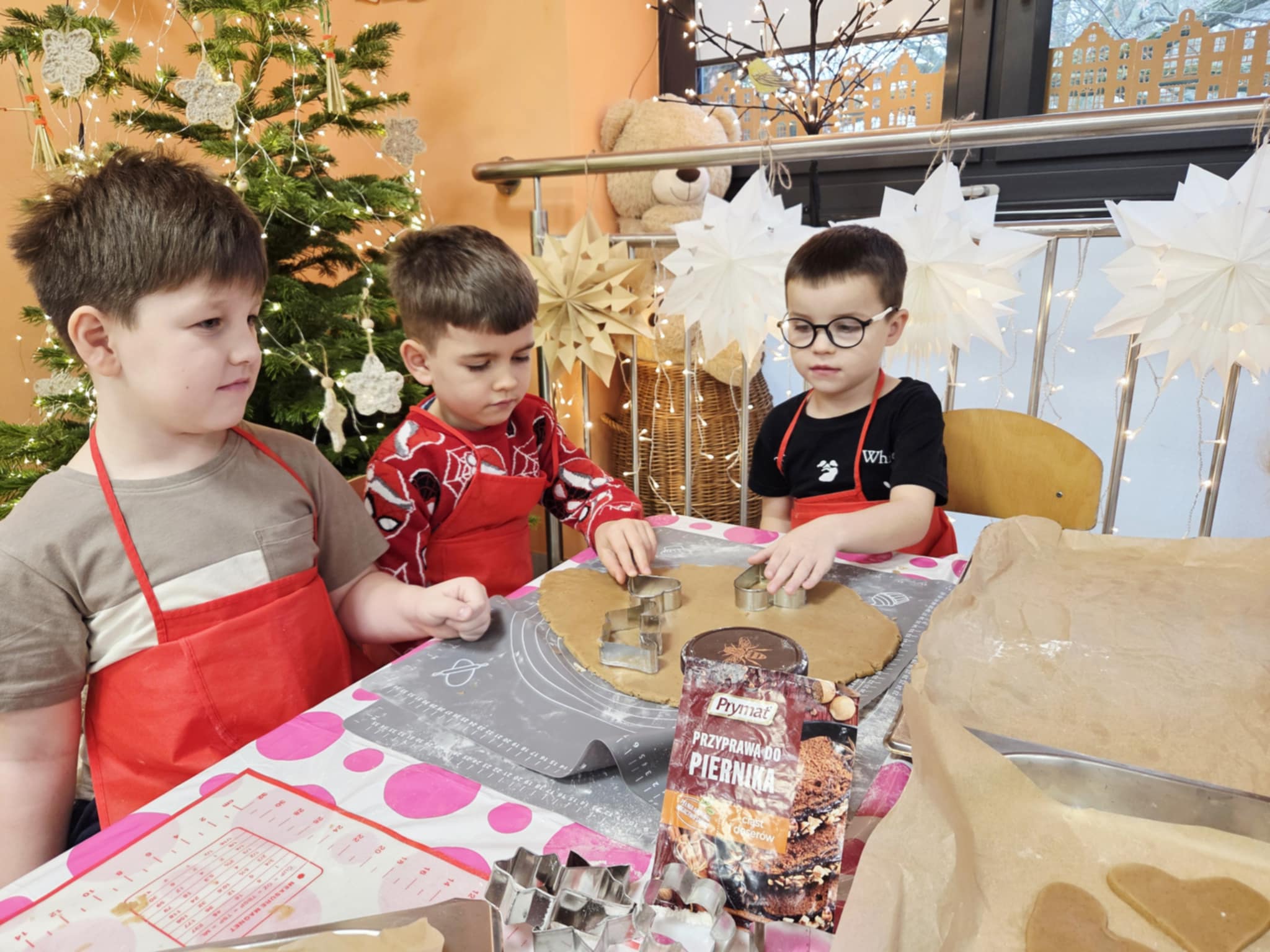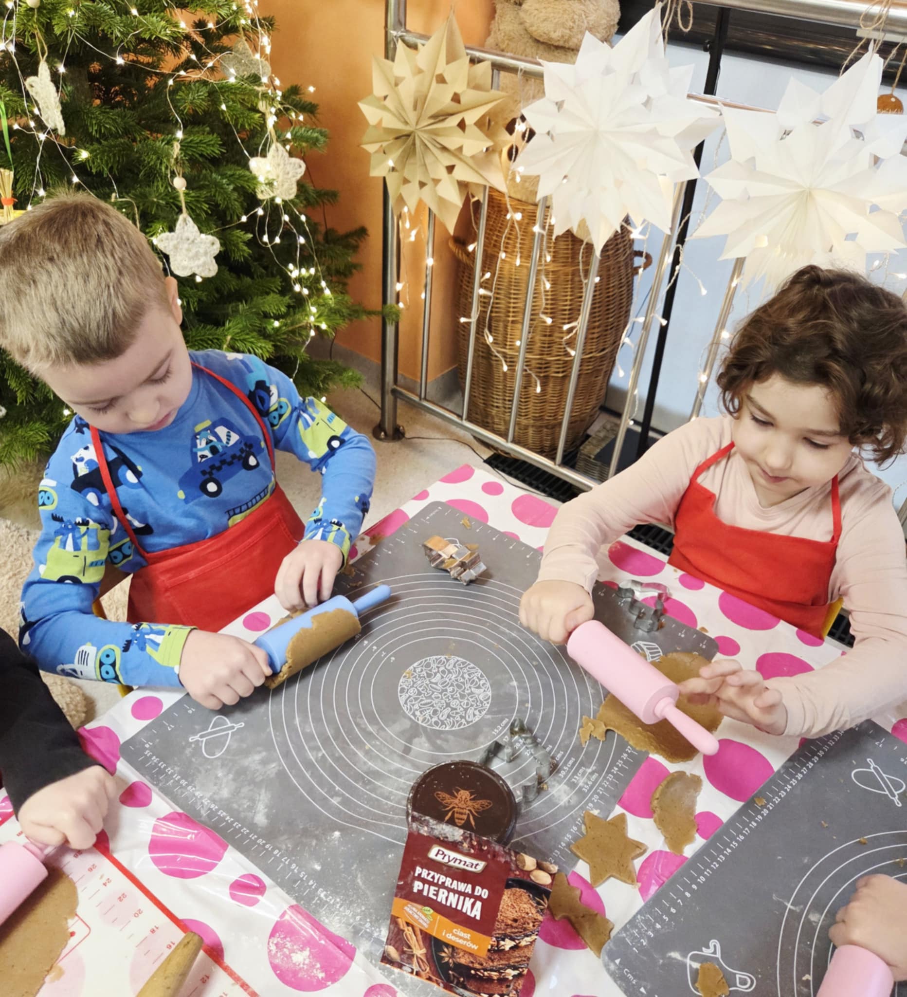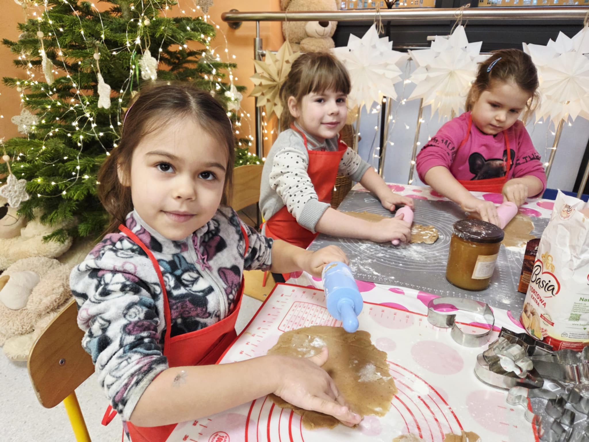 W przedświątecznym czasie dzieci z grupy Miśki wzięły udział we wspólnym pieczeniu pierników. Przedszkolaki z wielkim zaangażowaniem wałkowały ciasto, a z niego wykrawały pierniki. Zajęciom towarzyszyła radosna atmosfera oraz zapach korzennych przypraw. Wspólne pieczenie było doskonałą okazją do rozwijania samodzielności, współpracy i wprowadzenia dzieci w świąteczny nastrój.