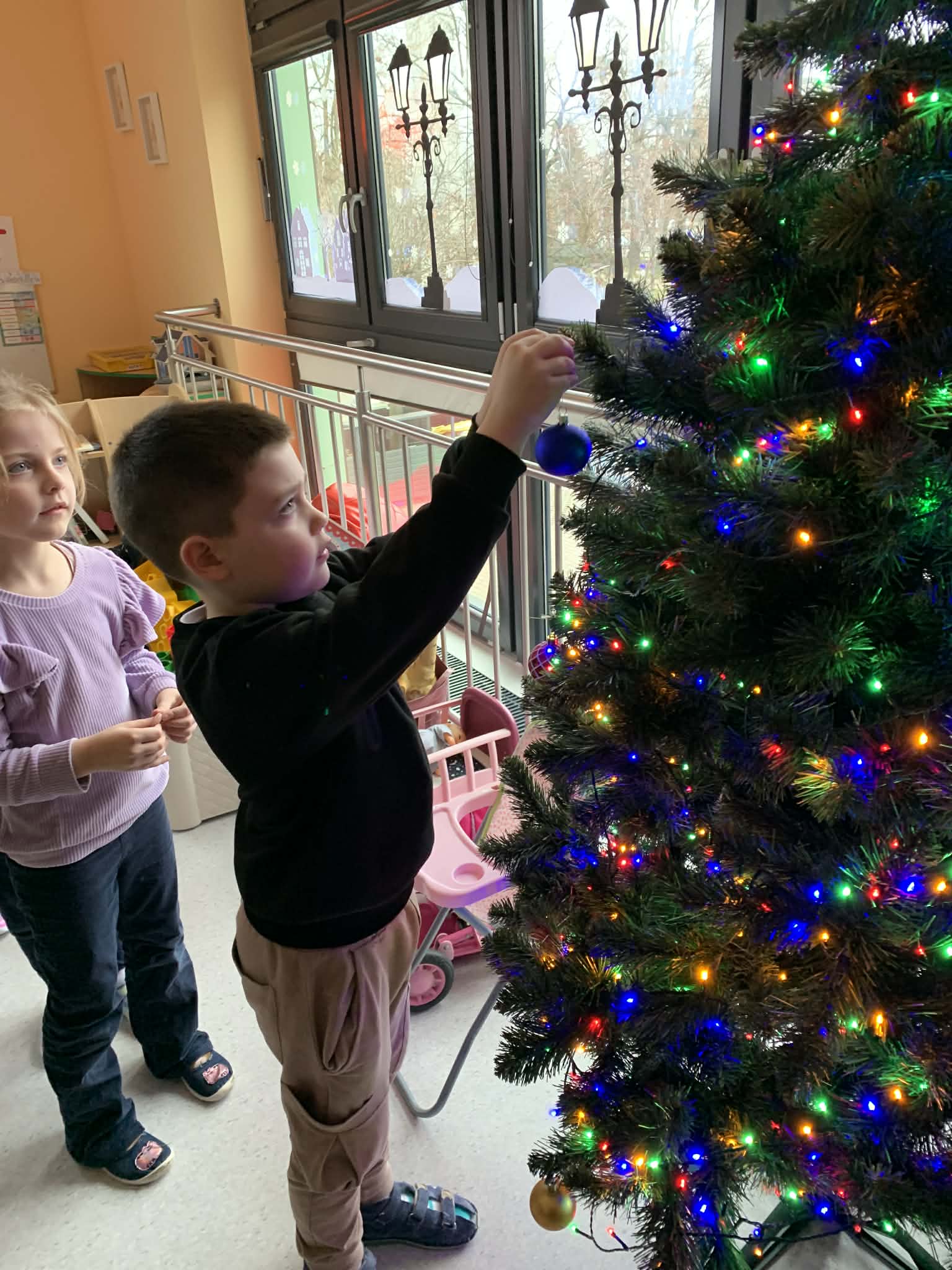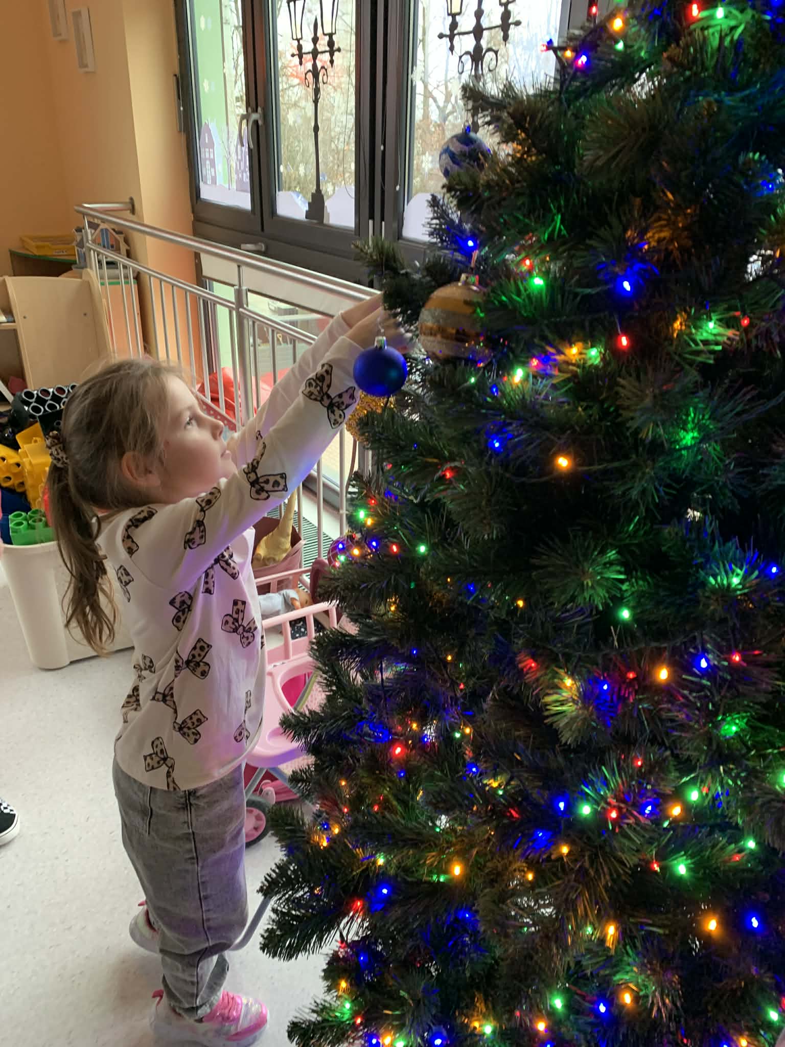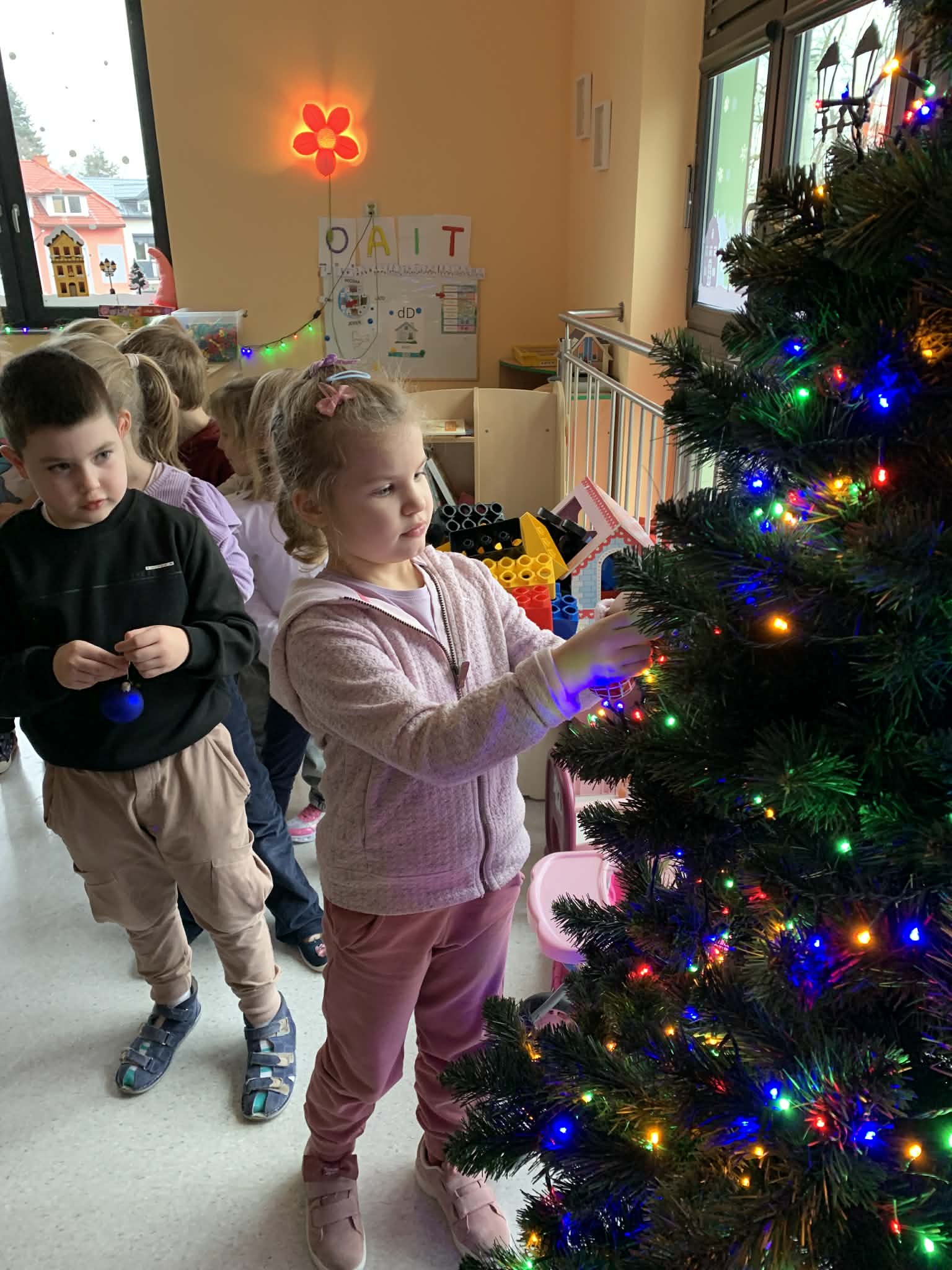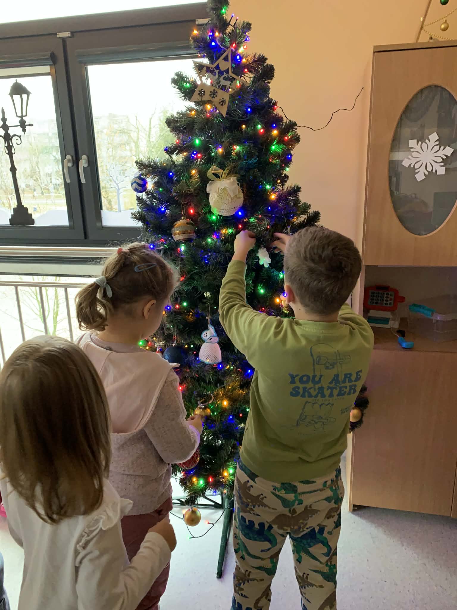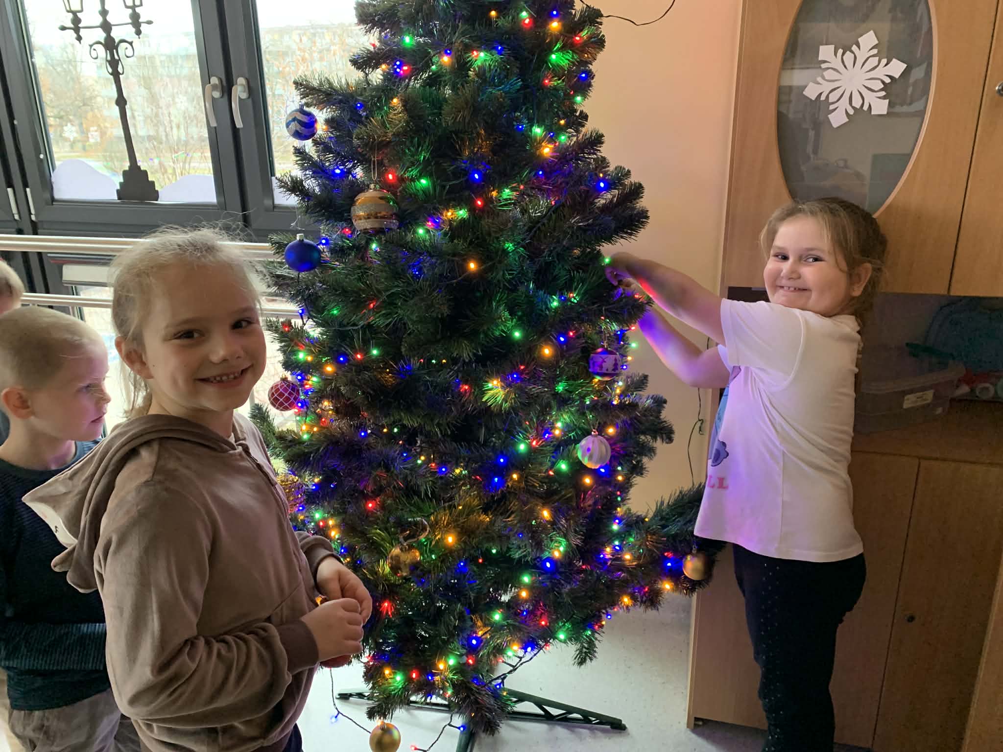 Ubieranie choinki - to moment, na który z niecierpliwością czekały wszystkie przedszkolaki. Rybki z wielkim zapałem przystąpiły do zawieszania na gałązkach ozdób, kolorowych lampek. Nasze drzewko zostało bardzo szybko przystrojone i wygląda wyjątkowo. A zdaniem dzieci jest najpiękniejszą choinką.