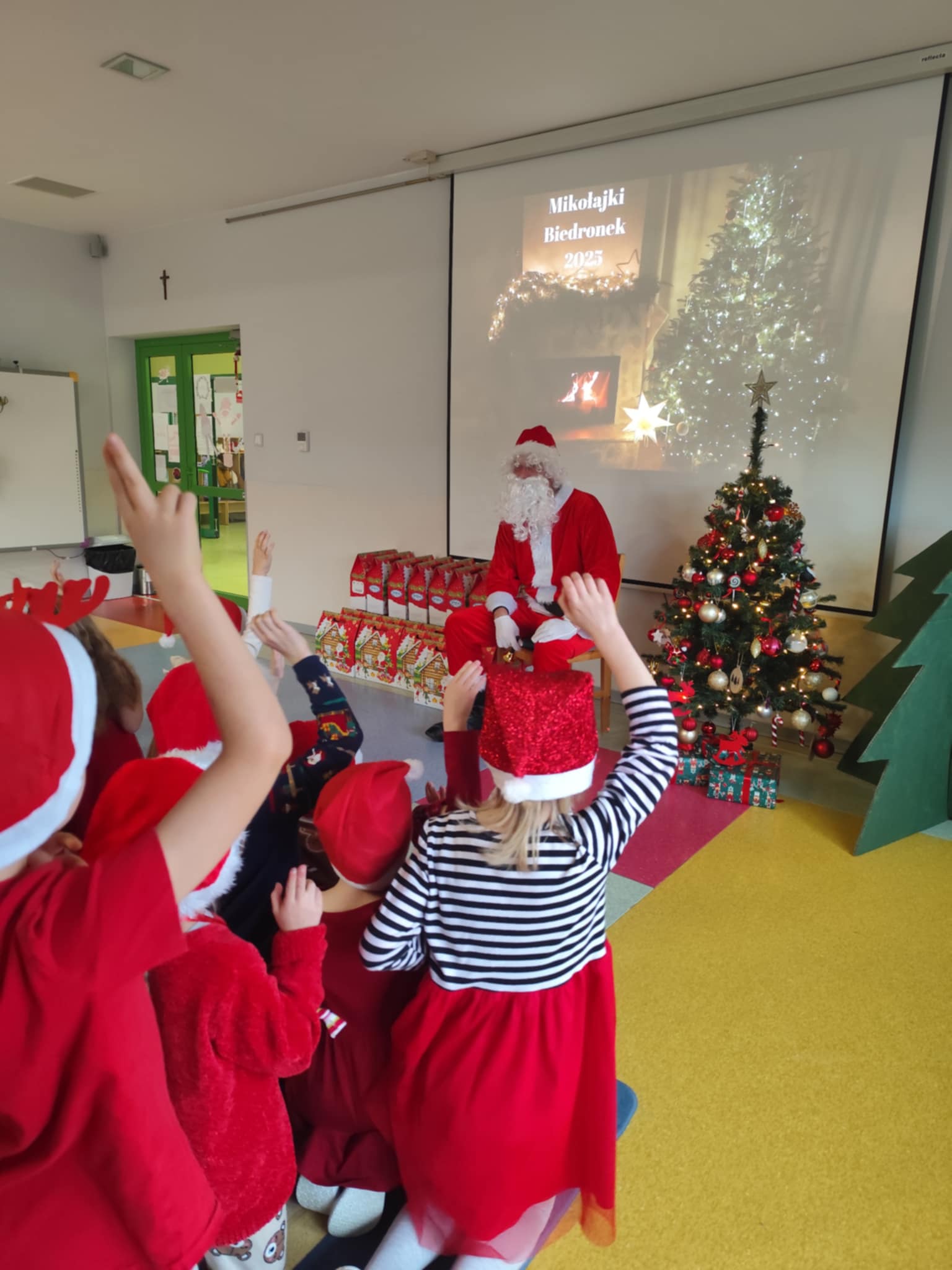 Przedszkolaki pięknie powitały Mikołaja, recytując przygotowane wierszyki, a w podziękowaniu wręczyły mu własnoręcznie przygotowane podarki. Oczywiście Święty Mikołaj nie pozostał dłużny – każde dziecko otrzymało wspaniały prezent, który wywołał wiele uśmiechów i radości.