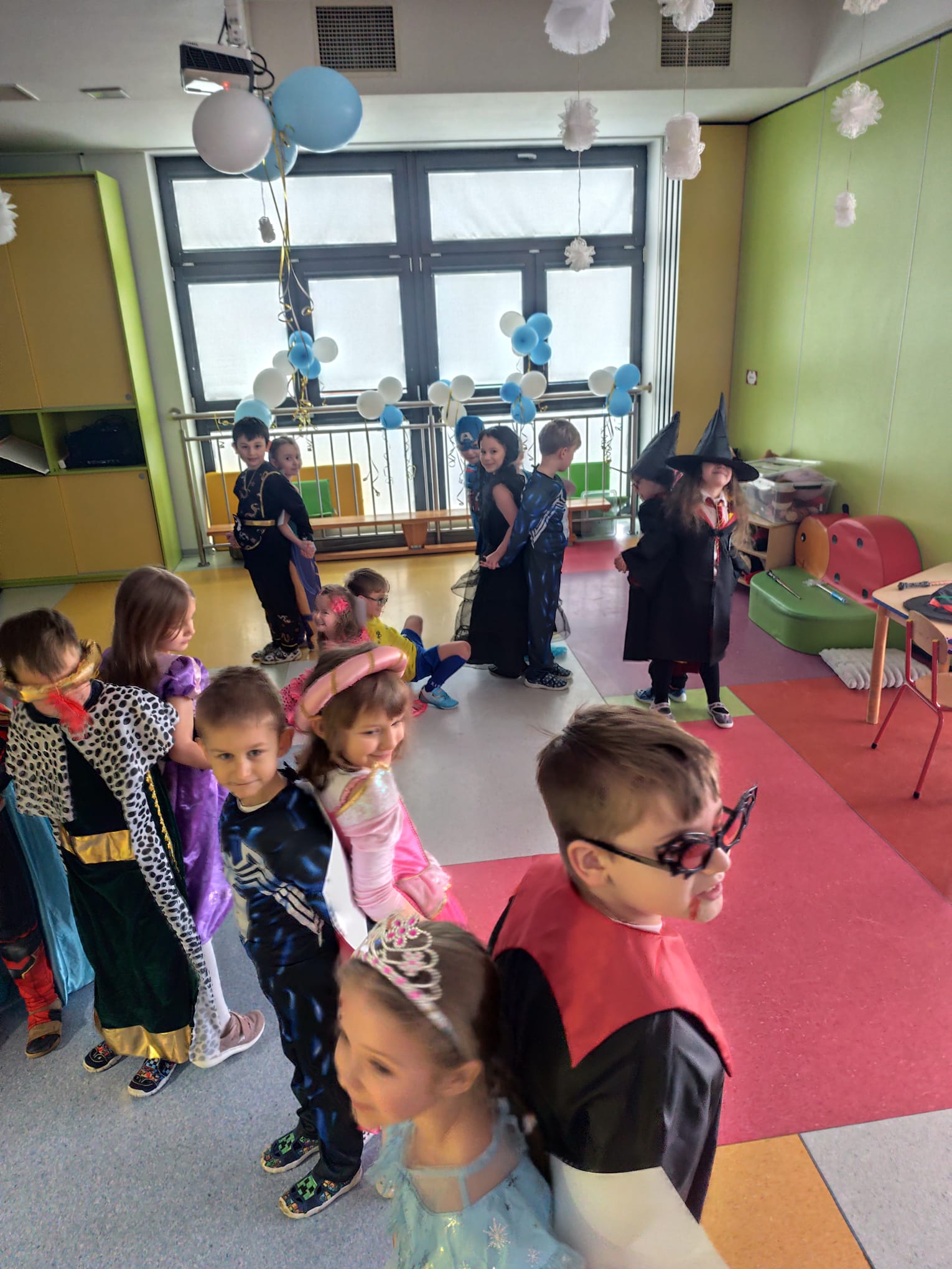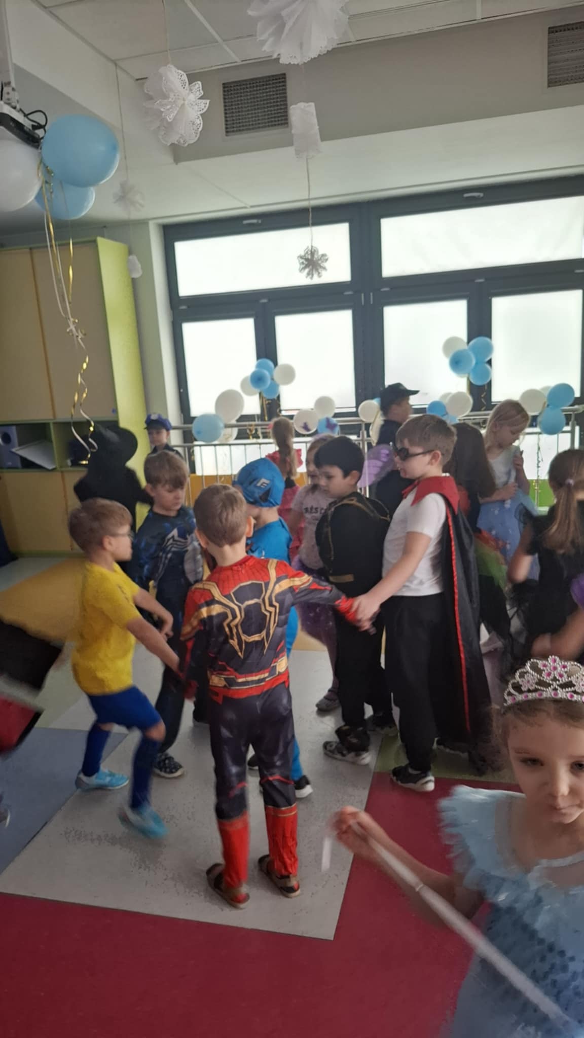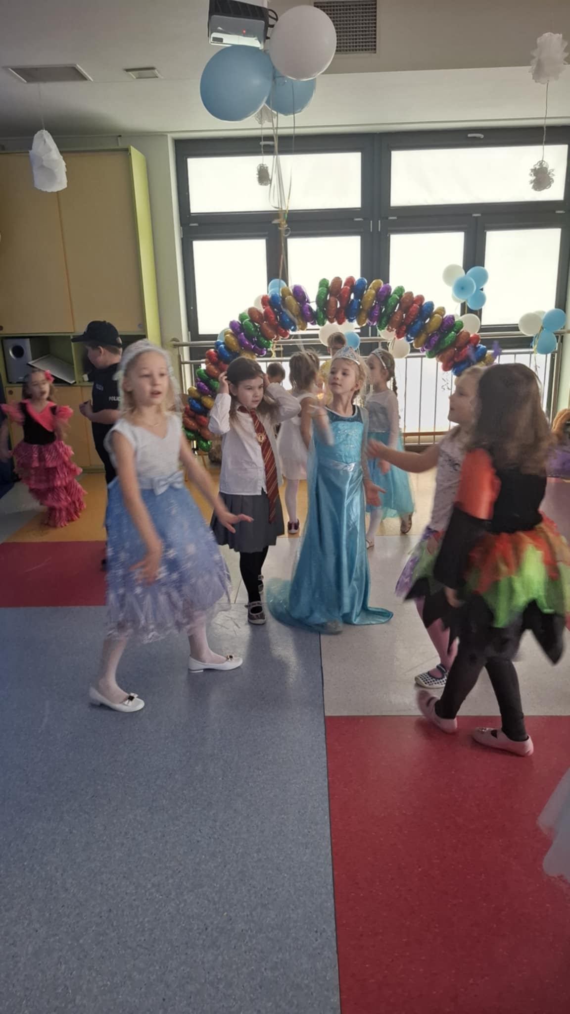 Podczas balu odbywały się liczne zabawy ruchowe i taneczne, które wypełniły salę radością, śmiechem i muzyką. Wspólne tańce oraz konkursy sprawiły dzieciom wiele radości i pozwoliły w pełni poczuć atmosferę karnawału.