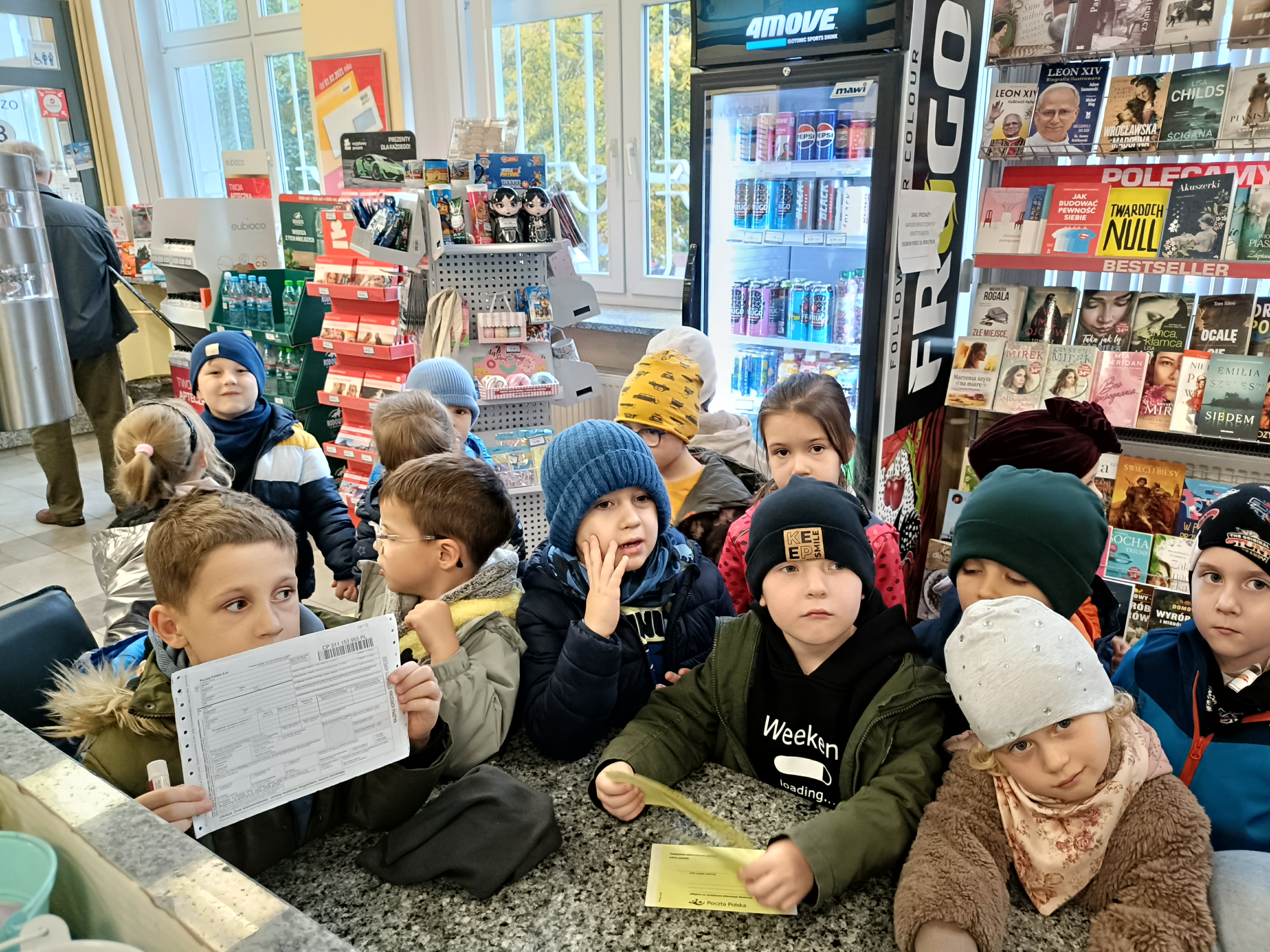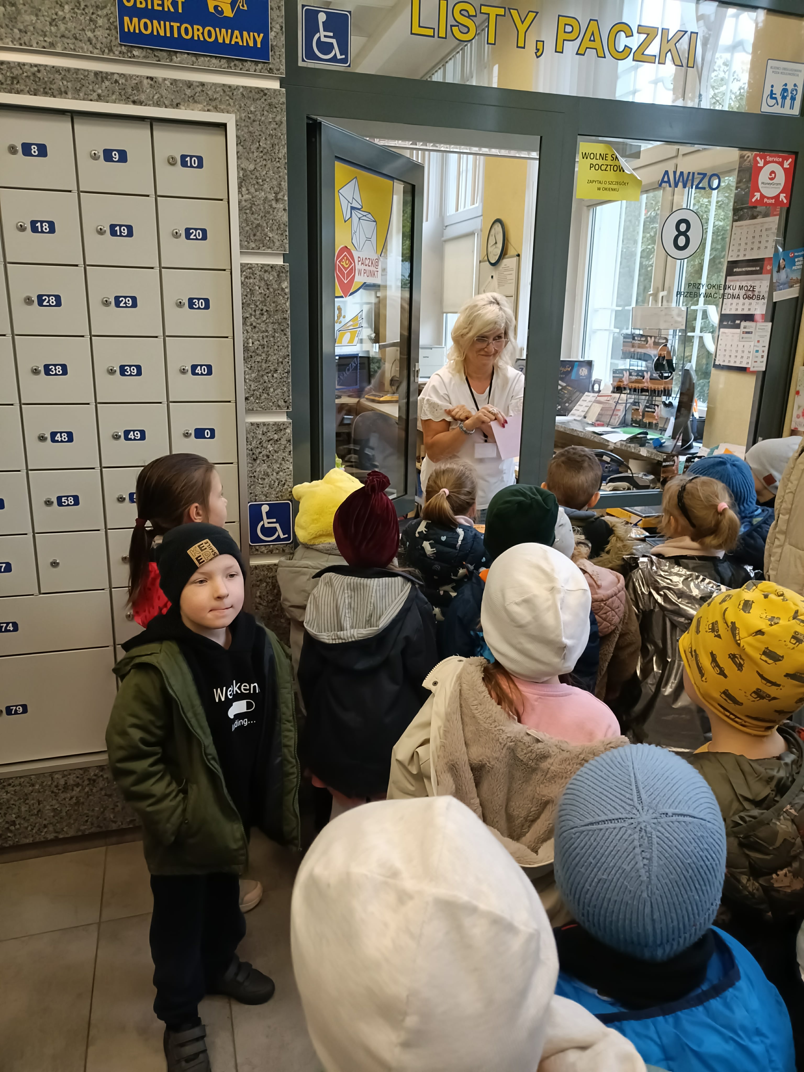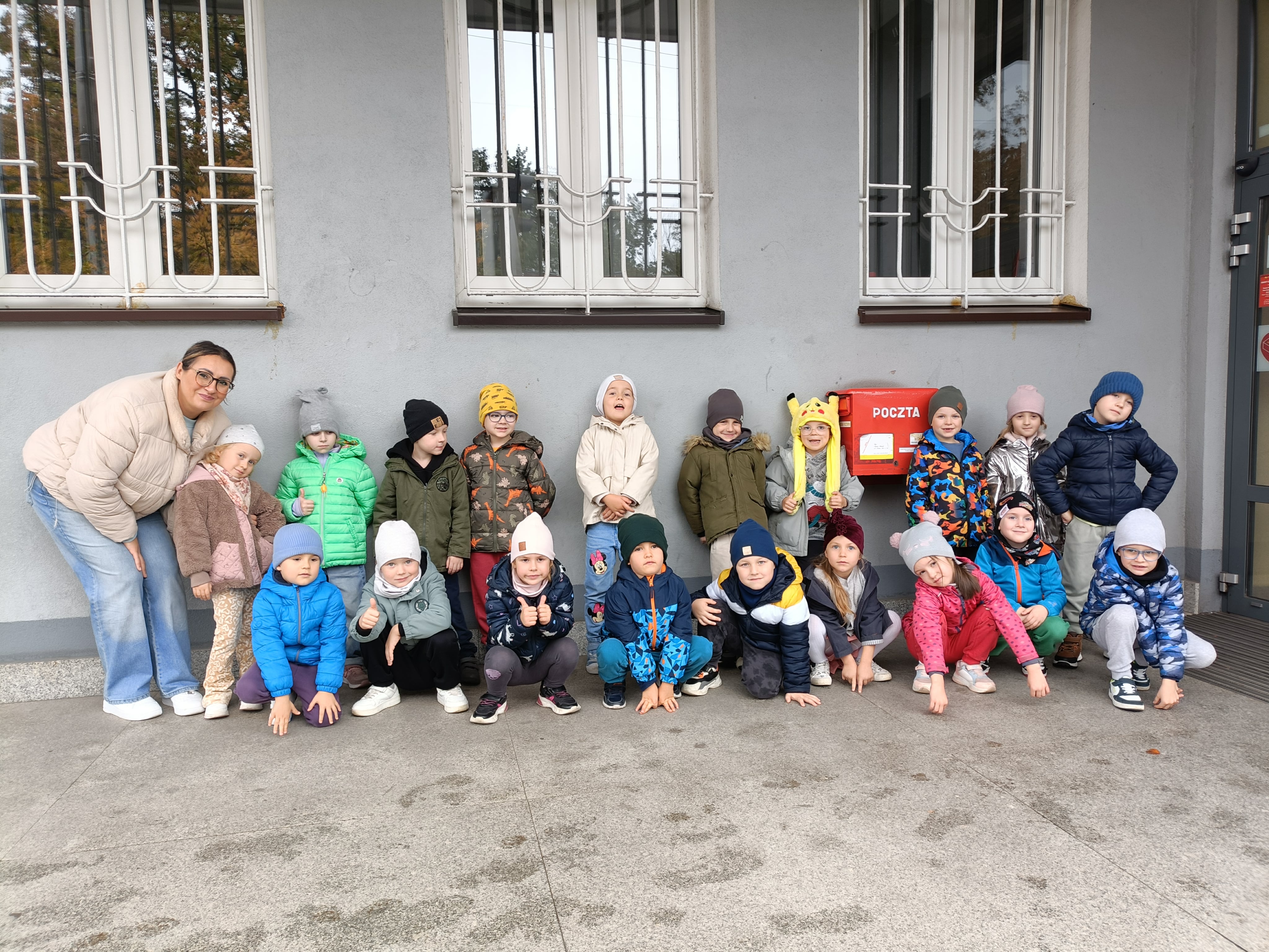Miśki wybrały się na krótką wycieczkę do Urzędu Pocztowego w Skierniewicach, aby poznać tajniki pracy listonoszy i pracowników poczty. Dowiedziały się, jak wygląda droga listu od nadawcy do adresata oraz jak ważną rolę pełni poczta w naszym codziennym życiu. Podczas wizyty dzieci samodzielnie zakupiły kartkę pocztową oraz znaczek, dokonały płatności i z dumą odebrały rachunek za swoje zakupy. Następnie z ogromną radością wysłały list. Wizyta na poczcie sprawiła Miśkom wiele radości i satysfakcji, a zdobyta wiedza z pewnością przyda się w przyszłości.