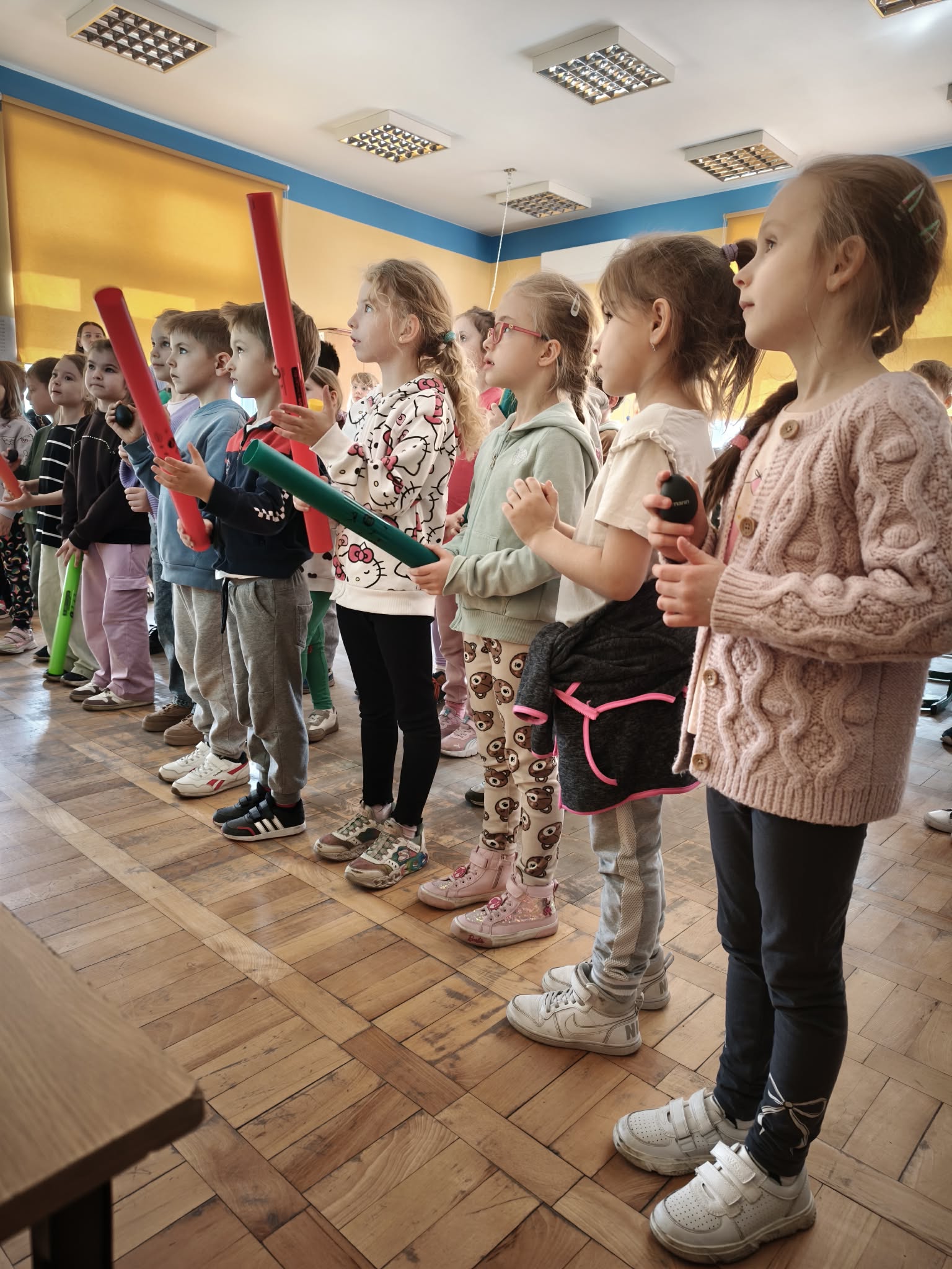 Na dzieci czekało wiele ciekawych atrakcji. Jednym z najciekawszych punktów wizyty były zajęcia muzyczne z wykorzystaniem bum bum rurek, które dostarczyły wszystkim mnóstwo radości i pozwoliły wspólnie tworzyć muzyczne kompozycje.