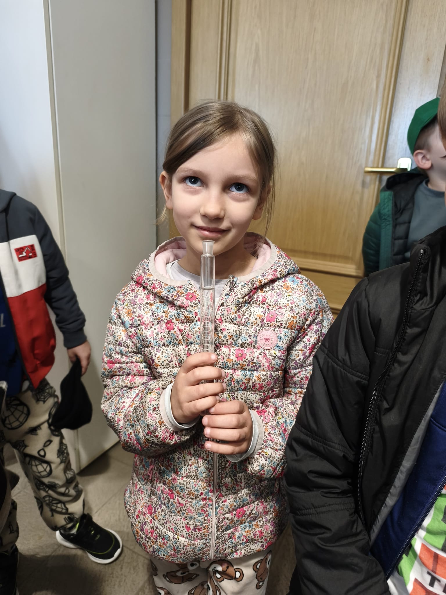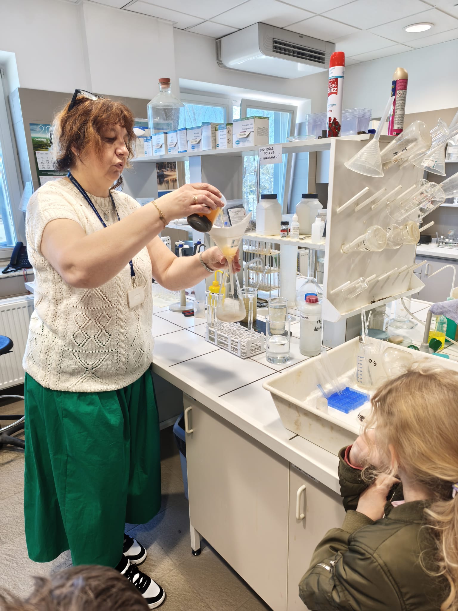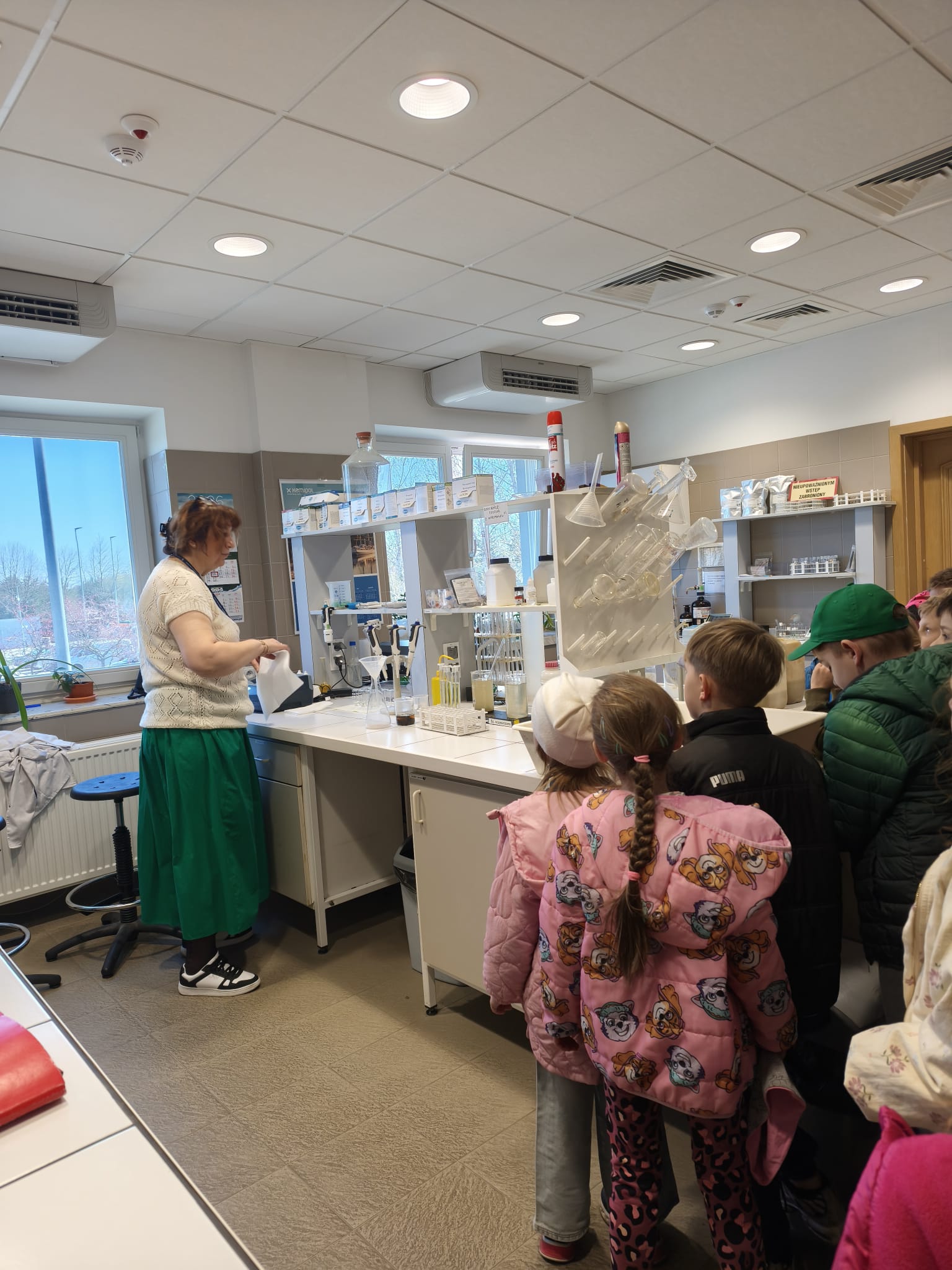 Kolejnym etapem wycieczki była wizyta w laboratorium. Tam dzieci spotkały się z panią, która pokazała im różne próbki wody oraz opowiedziała o tym, jak bada się jej czystość. Przedszkolaki miały również okazję zobaczyć, jak w prosty sposób można wykonać filtr do wody, co wzbudziło ogromne zainteresowanie i wiele pytań. Dzieci dowiedziały się również, jak ważne jest odpowiednie oczyszczanie ścieków i dbanie o środowisko.