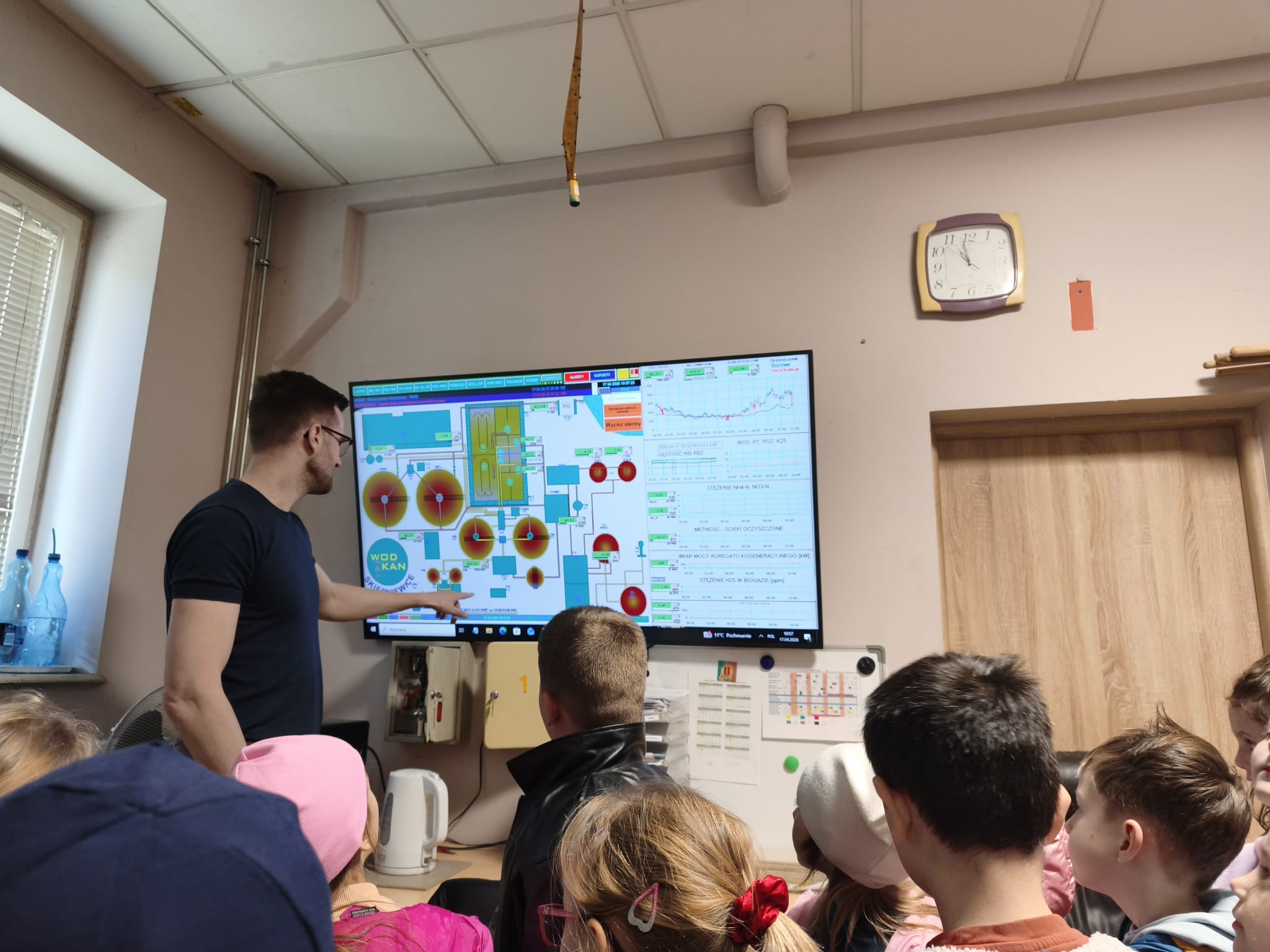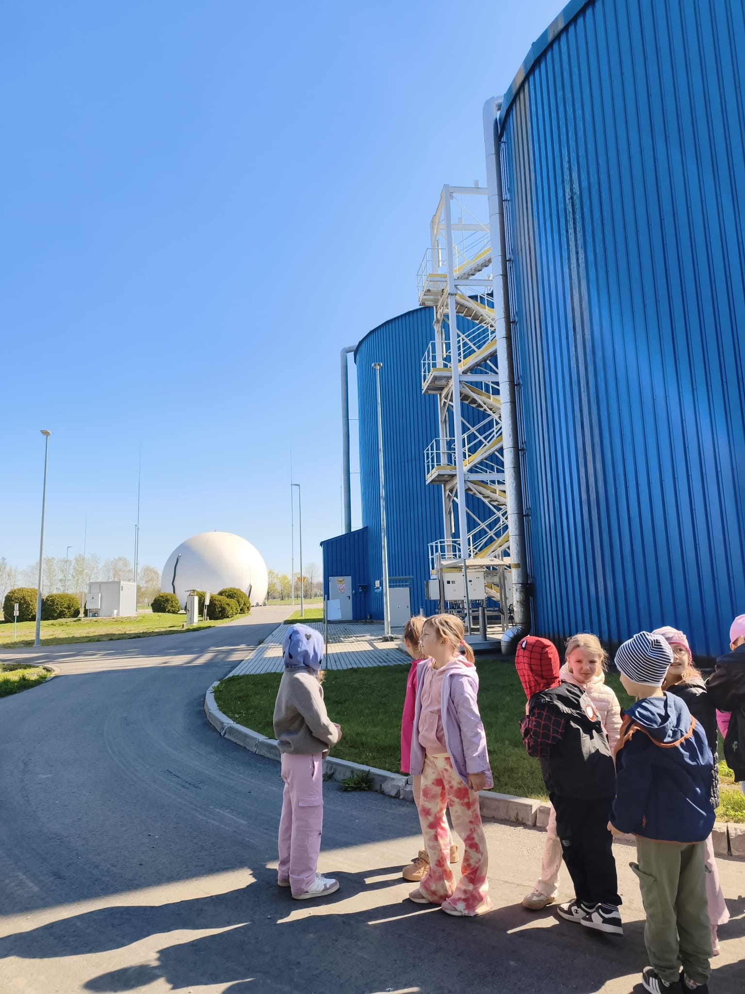 Na początku wizyty przedszkolaki spacerowały po terenie zakładu, oglądając jego zewnętrzną infrastrukturę. Dzieci z zainteresowaniem przyglądały się różnym urządzeniom oraz zbiornikom, a towarzyszący im pracownicy chętnie opowiadali, do czego służą poszczególne elementy. Panowie oprowadzający grupę w przystępny i ciekawy sposób przybliżyli dzieciom, jak wygląda proces dostarczania wody do domów oraz odprowadzania i oczyszczania ścieków.
