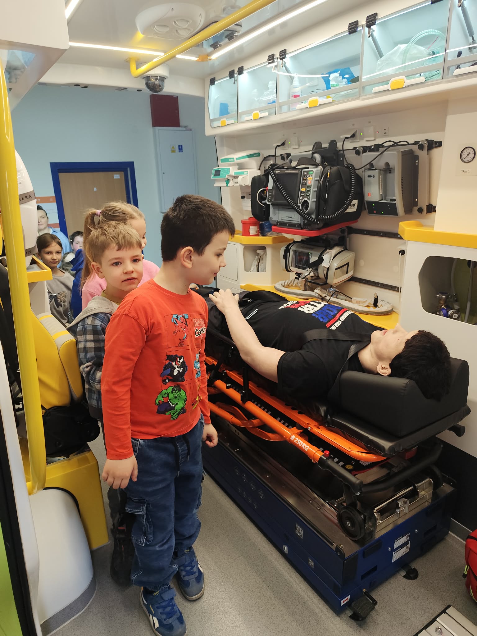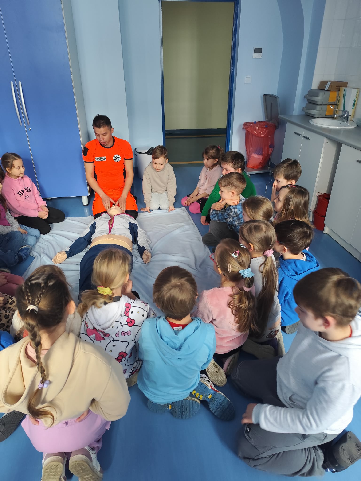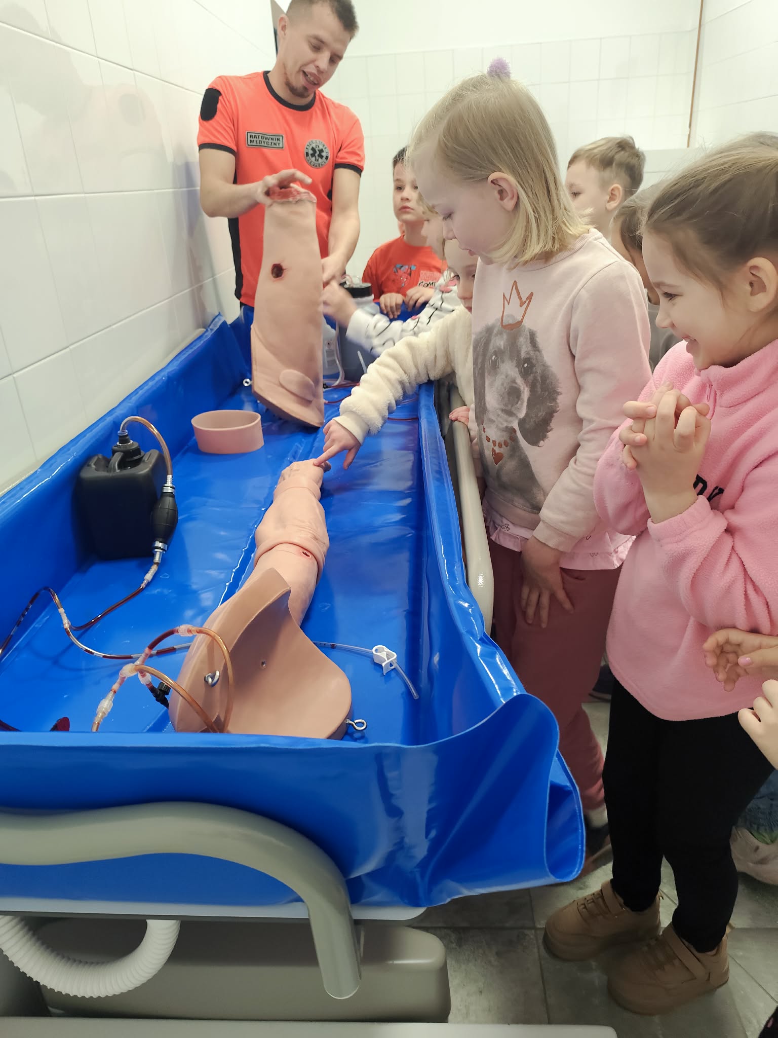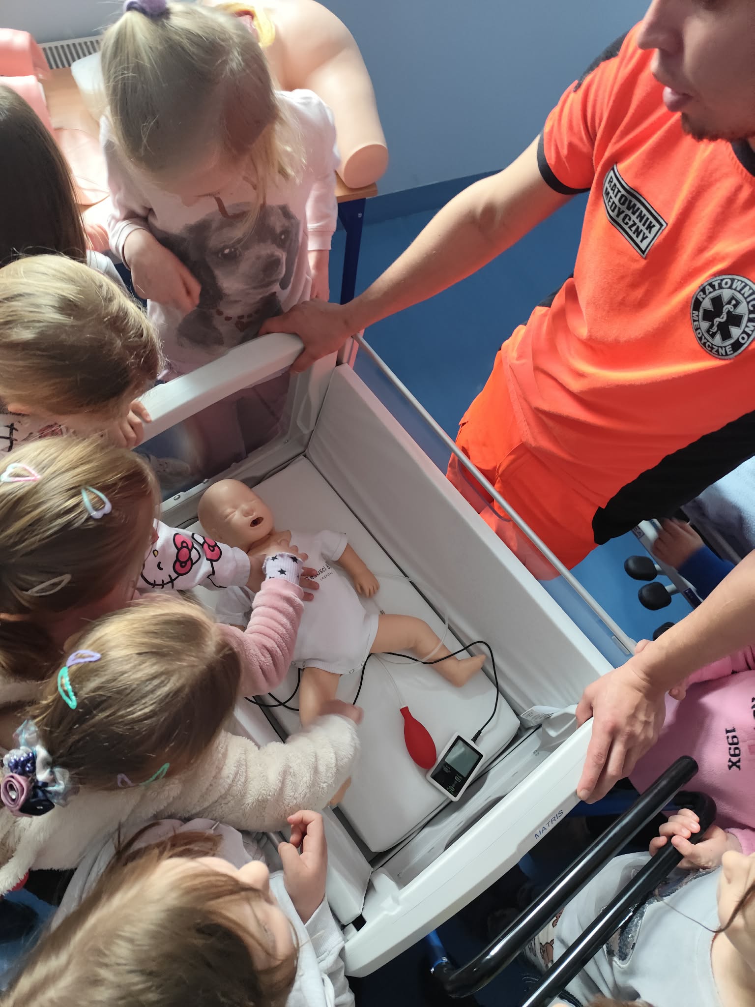 30 marca Biedronki wybrały się na wyjątkową wizytę na Wydziale Ratownictwa Medycznego Akademii Nauk Stosowanych. Podczas spotkania ratownik medyczny, Pan Marek, w ciekawy i przystępny sposób pokazał dzieciom, jak ważne jest pomaganie innym – i że wcale nie musi być trudne. Przedszkolaki dowiedziały się, jak prawidłowo wezwać pomoc, poznały podstawy udzielania pierwszej pomocy oraz miały okazję zobaczyć i spróbować obsługi sprzętu medycznego. Najwięcej radości sprawiła jednak możliwość wejścia do prawdziwego ambulansu, co było dla wszystkich ogromnym przeżyciem. Dzięki tej wizycie Biedronki już wiedzą, że ratownik medyczny to prawdziwy bohater, który zawsze jest gotowy nieść pomoc innym. Serdecznie dziękujemy za niezwykle wartościowe i inspirujące spotkanie – być może ta wiedza kiedyś pomoże uratować komuś życie.