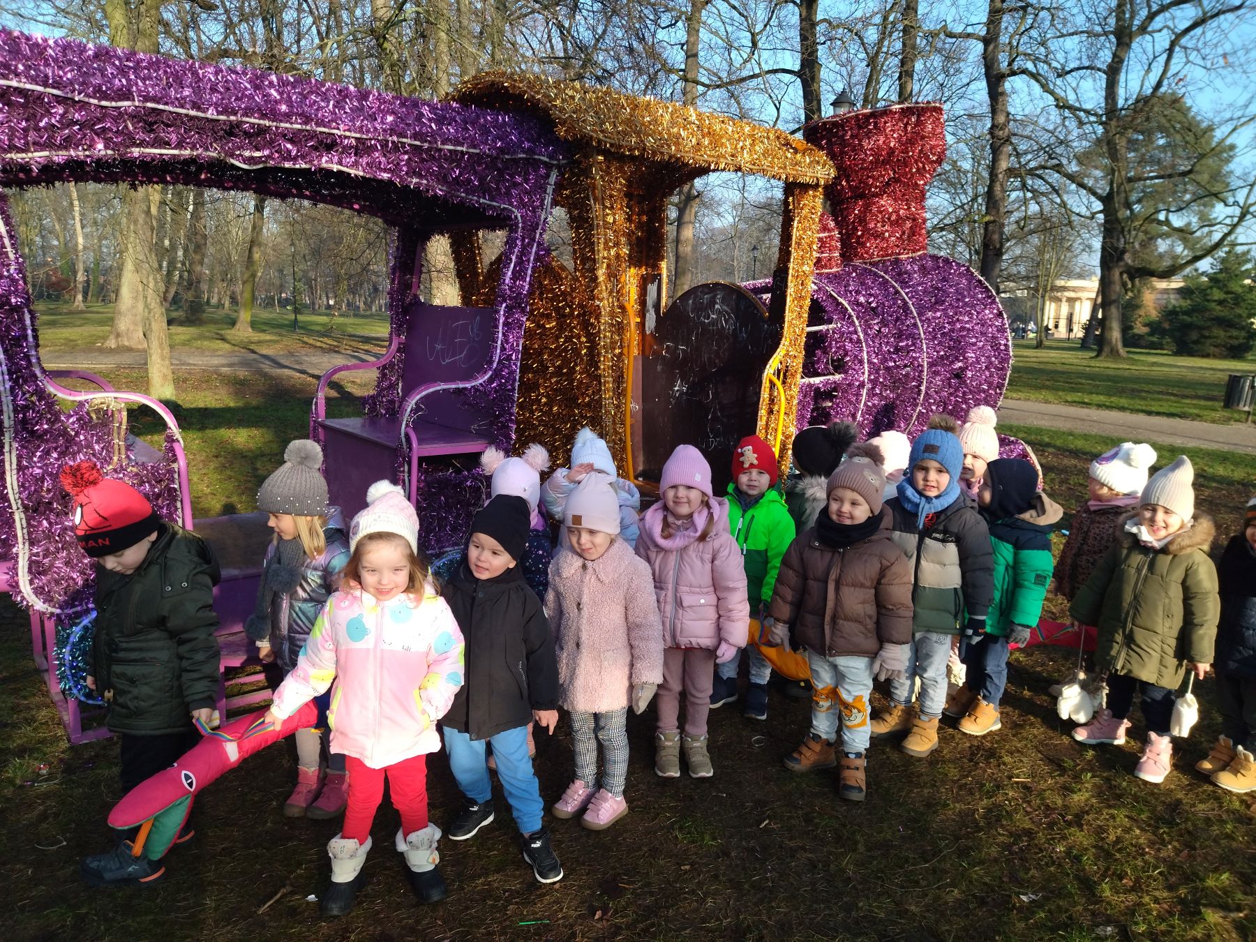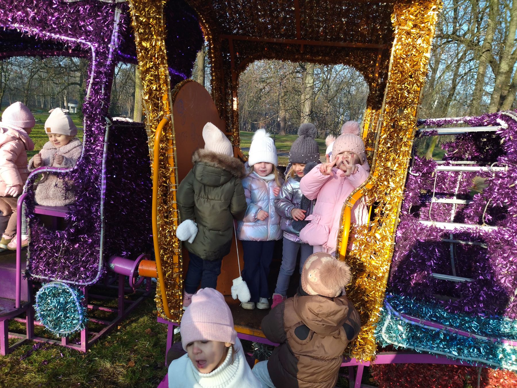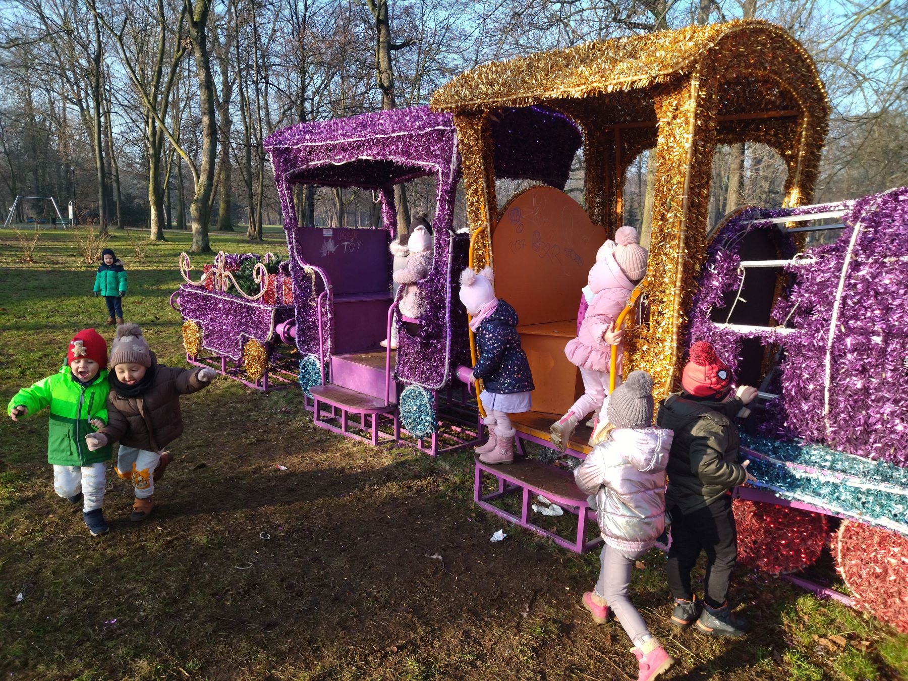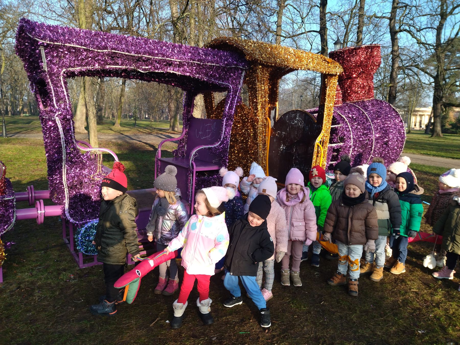 Myszki, korzystając ze słonecznej pogody, wybrały się na plac zabaw, a także na spacer do parku, gdzie z radością obejrzały kolorowy świąteczny pociąg Mikołaja.