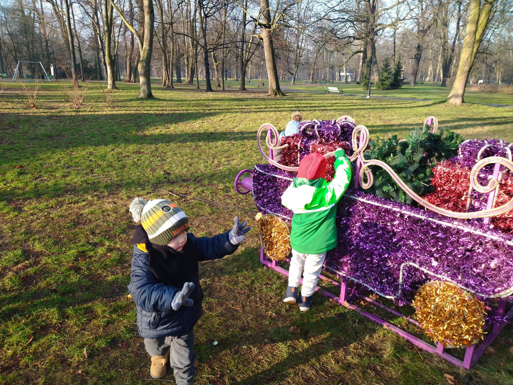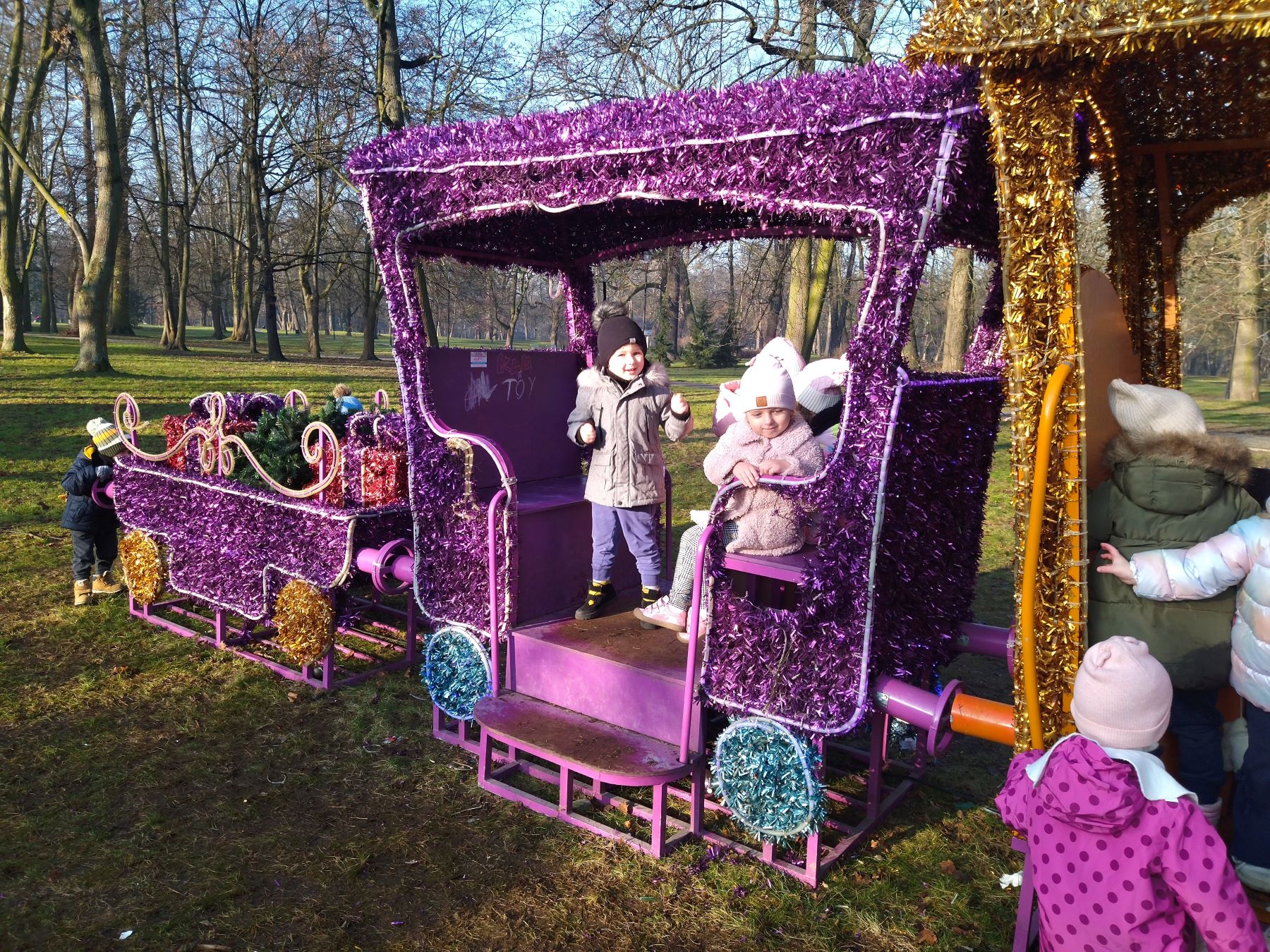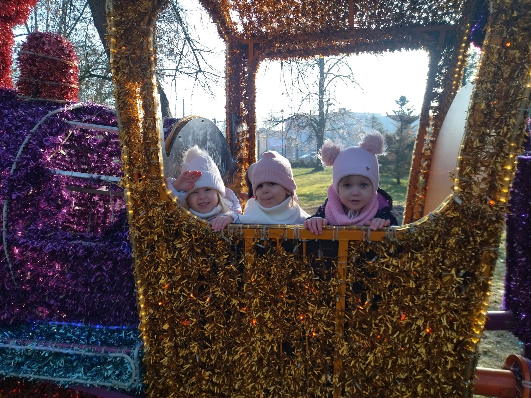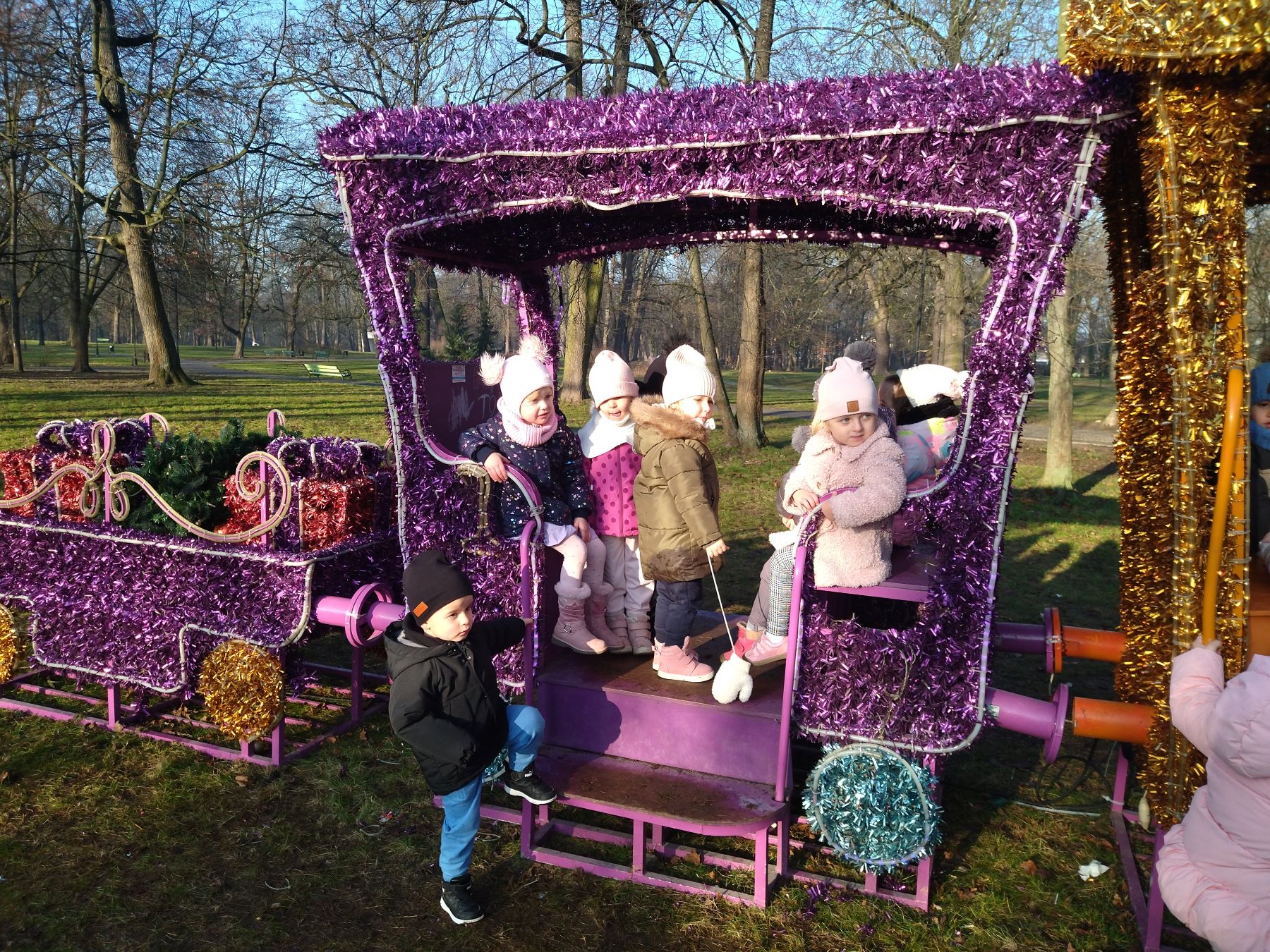 Myszki, korzystając ze słonecznej pogody, wybrały się na plac zabaw, a także na spacer do parku, gdzie z radością obejrzały kolorowy świąteczny pociąg Mikołaja.