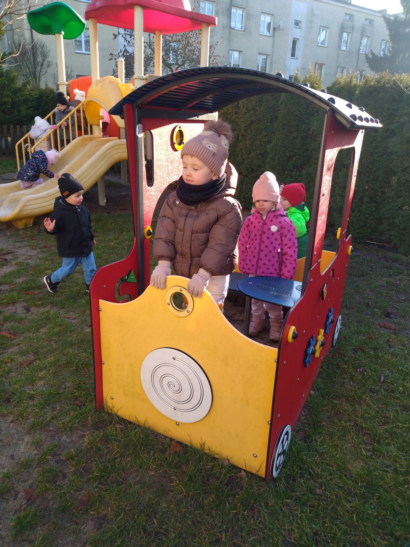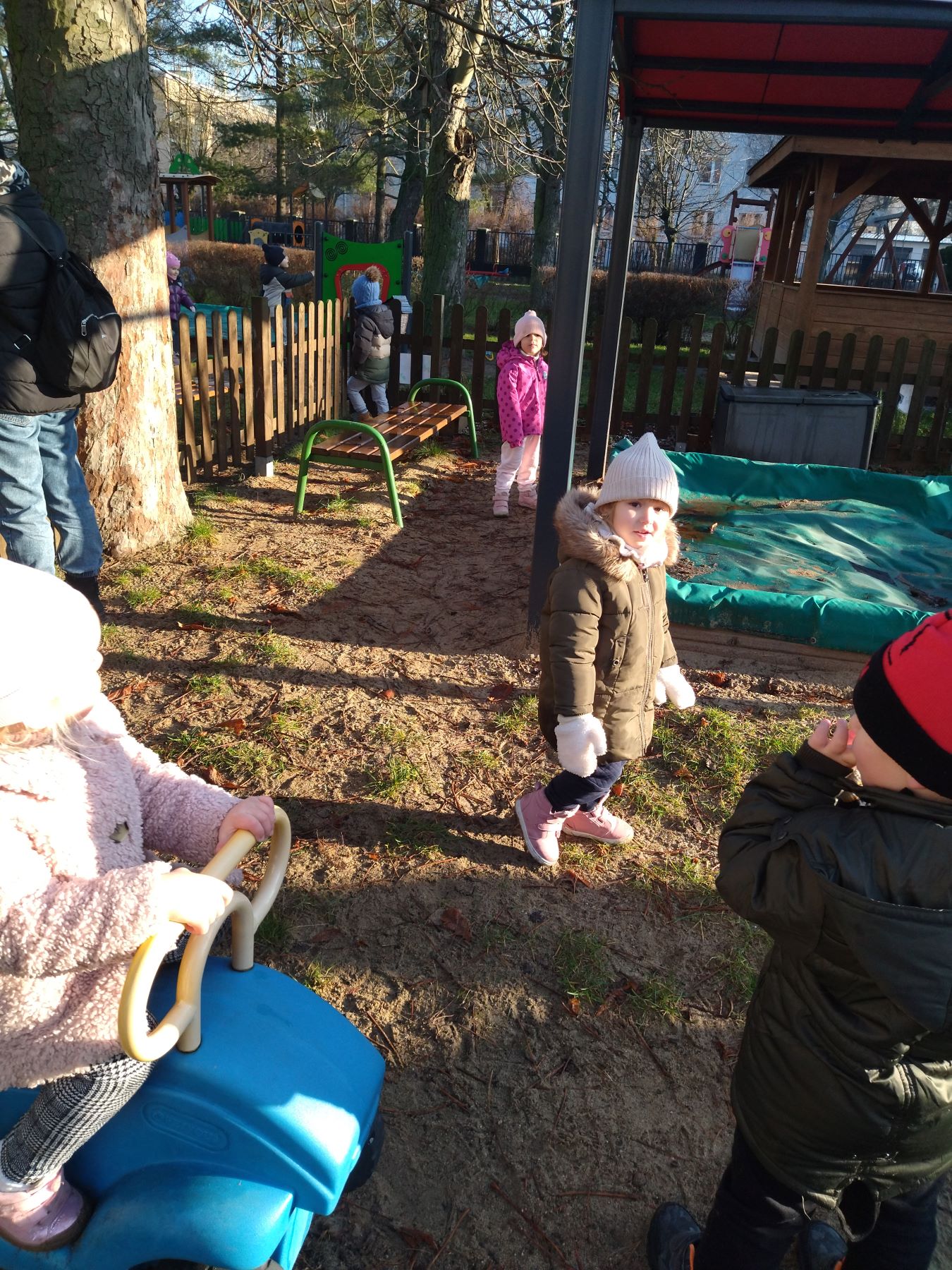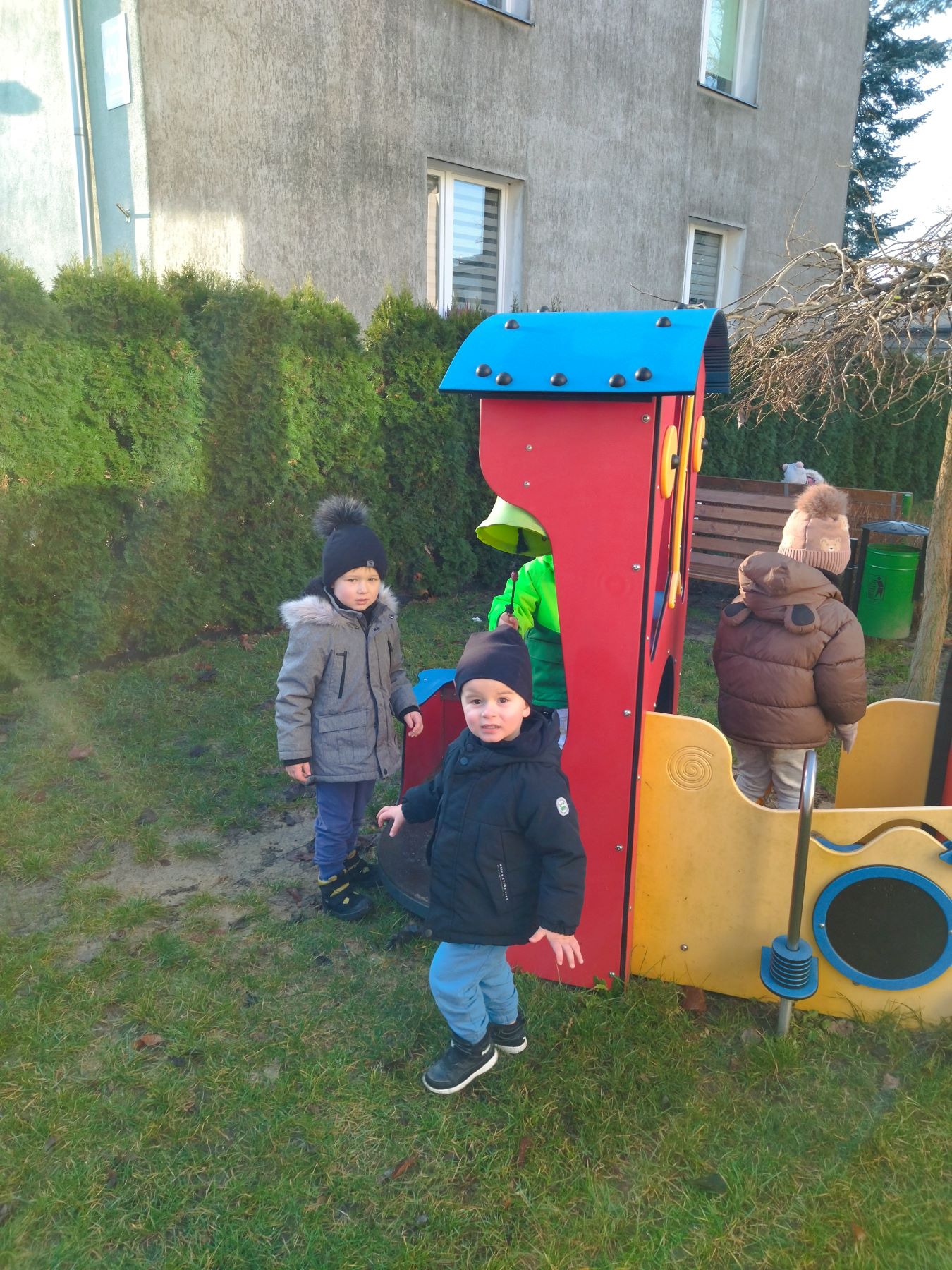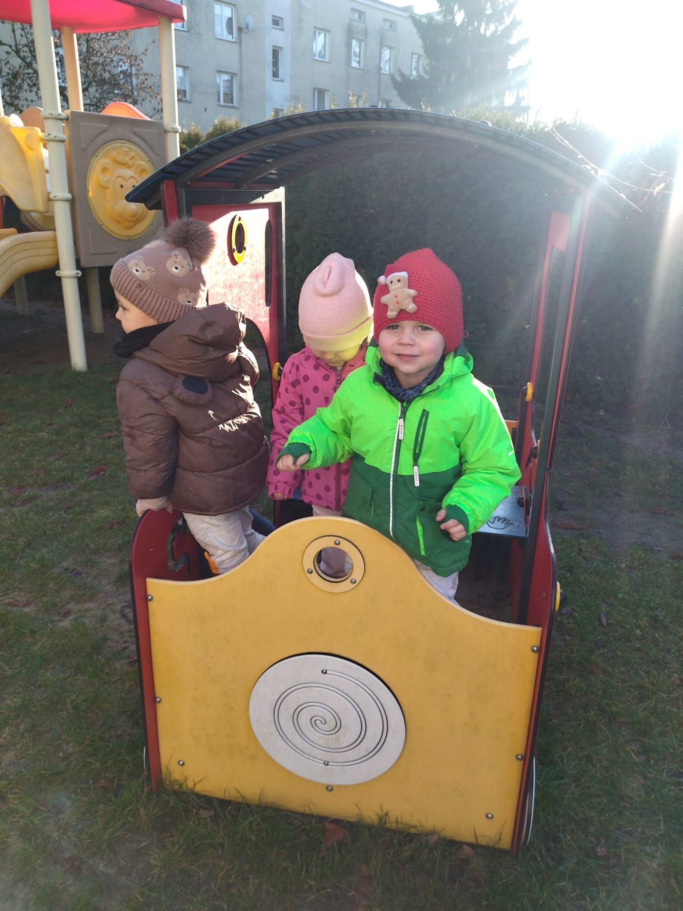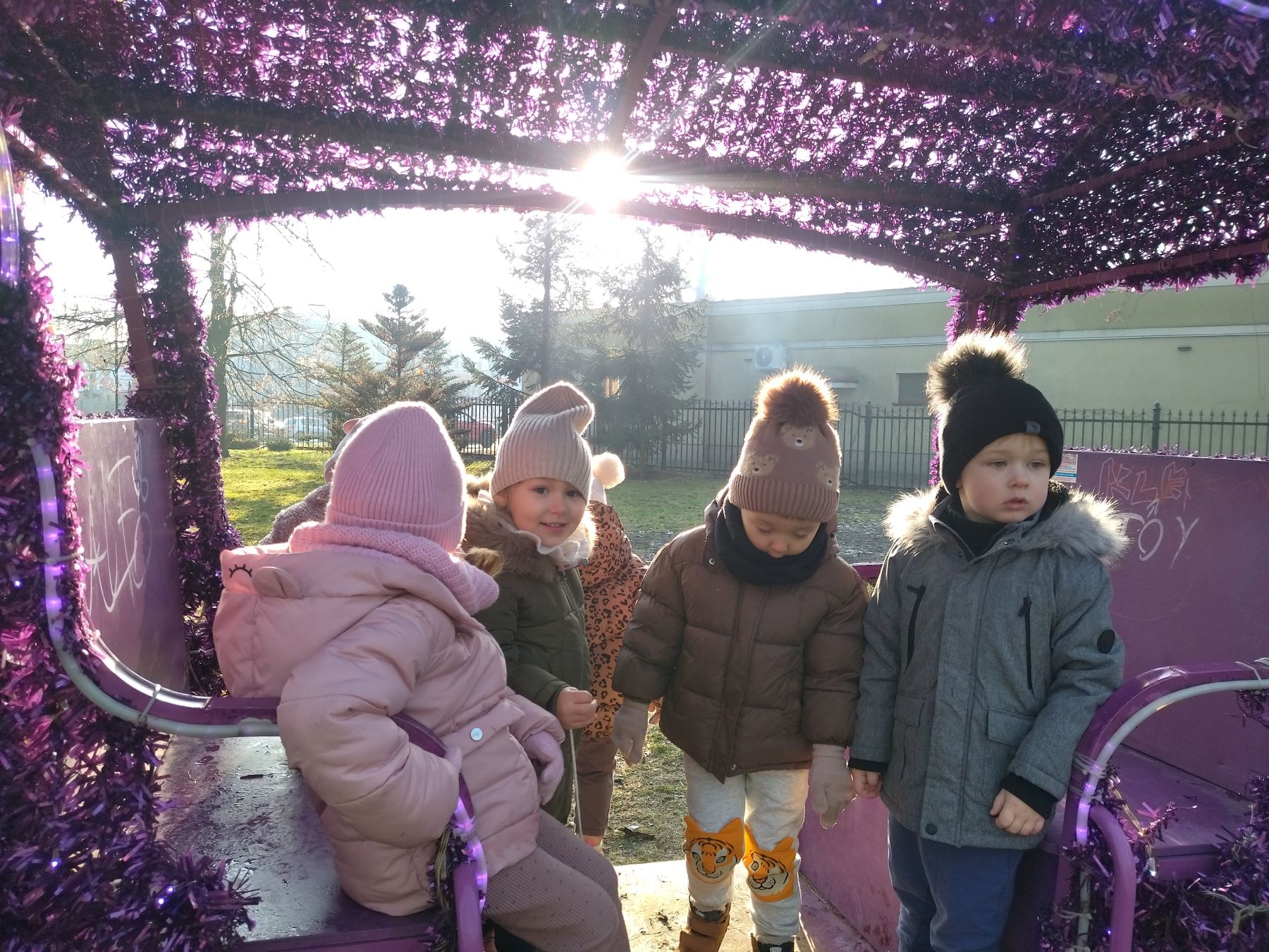 Myszki, korzystając ze słonecznej pogody, wybrały się na plac zabaw, a także na spacer do parku, gdzie z radością obejrzały kolorowy świąteczny pociąg Mikołaja.