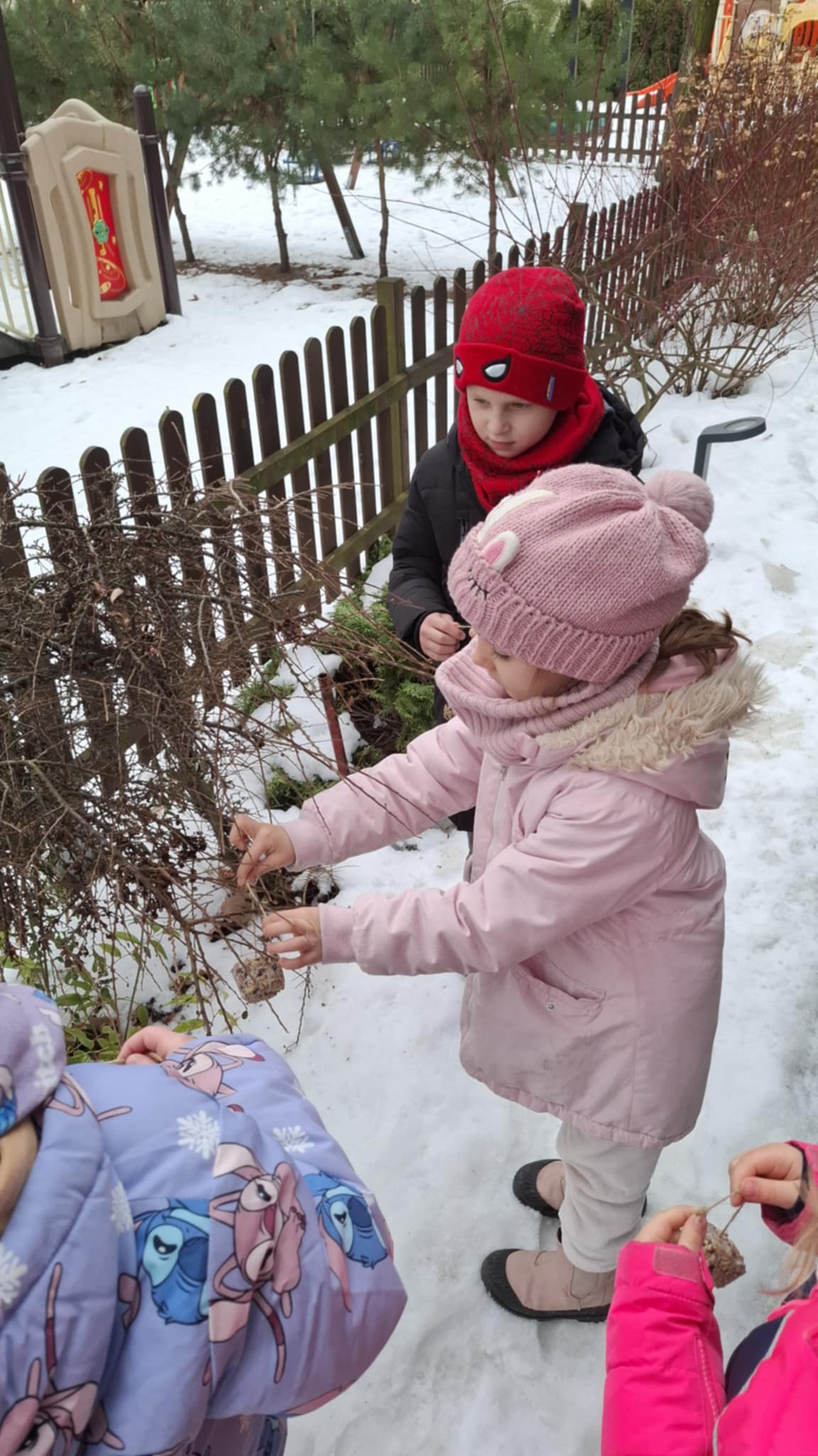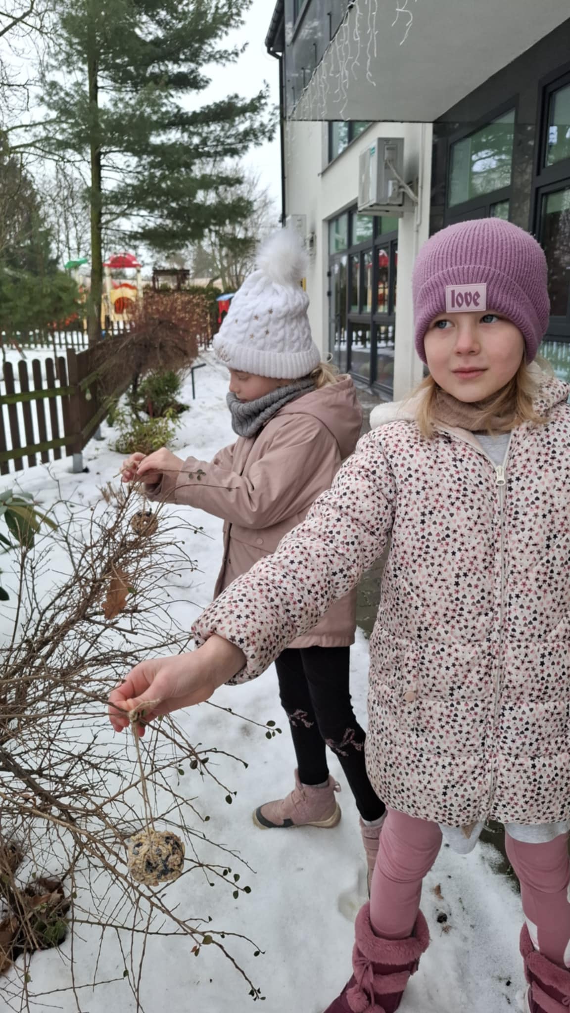 Po zakończeniu pracy mali przyrodnicy wspólnie zawiesili wykonane przysmaki na gałęziach drzew na przedszkolnym placu zabaw. Była to doskonała okazja do rozmów o potrzebach ptaków, zwłaszcza w chłodniejszym okresie, oraz do kształtowania postaw proekologicznych.