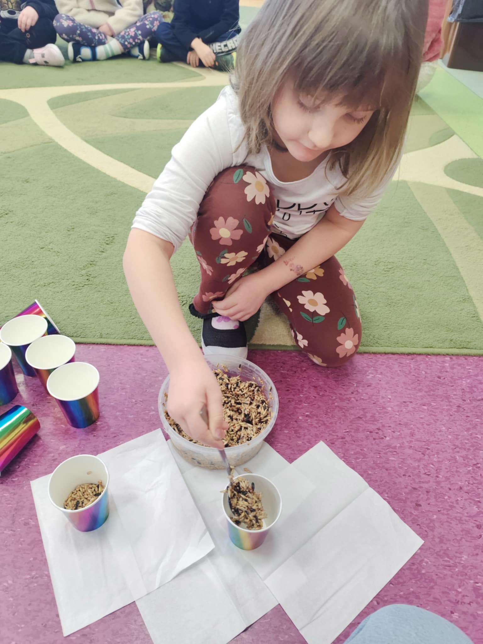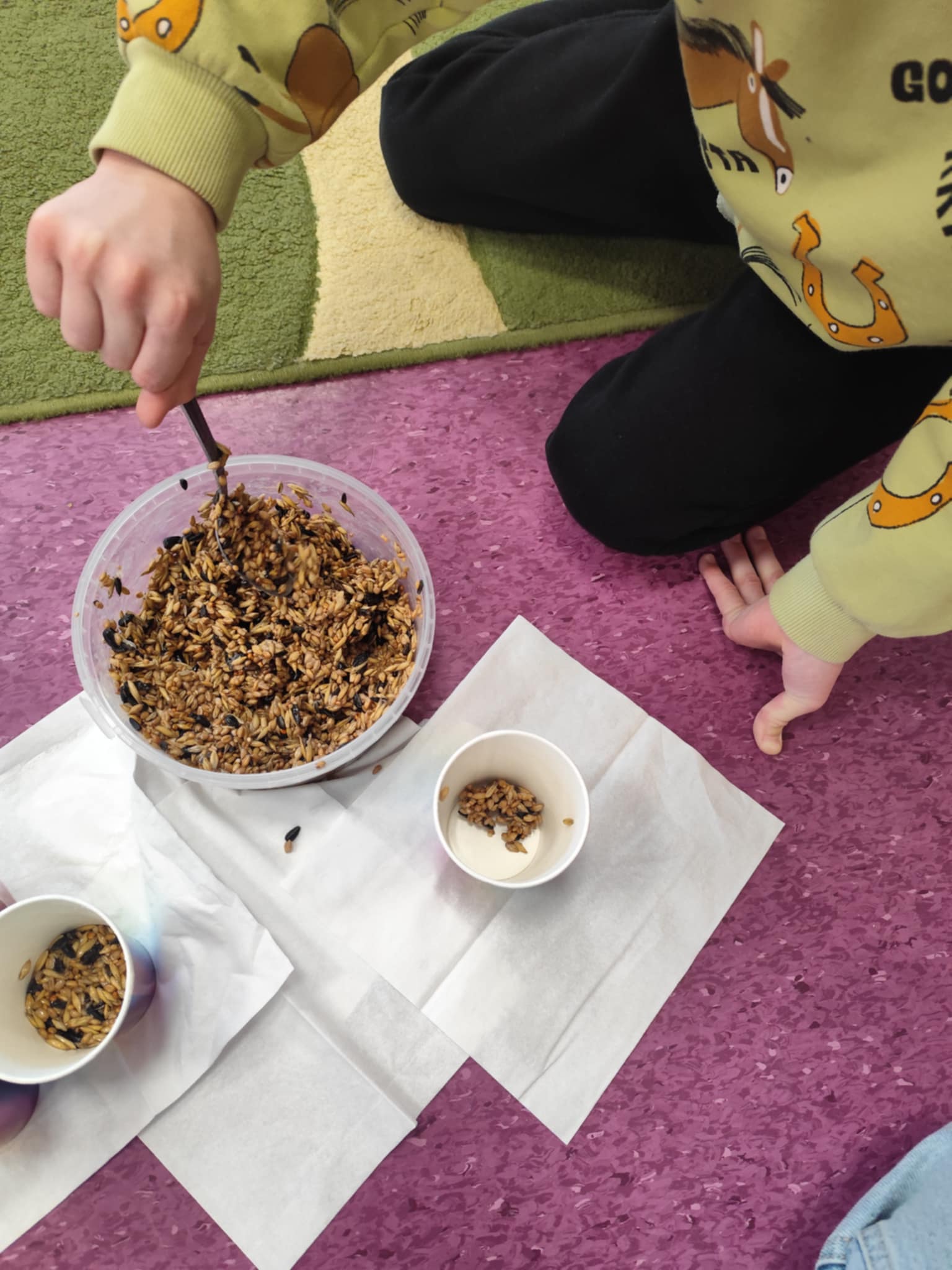 W naszym przedszkolu nie brakuje działań uczących wrażliwości na przyrodę. Podczas ostatnich zajęć dzieci samodzielnie przygotowywały przysmaki dla ptaków. Z wielkim zaangażowaniem i radością ozdabiały je ziarnami, dbając o to, aby były nie tylko estetyczne, ale przede wszystkim pożywne dla skrzydlatych gości.